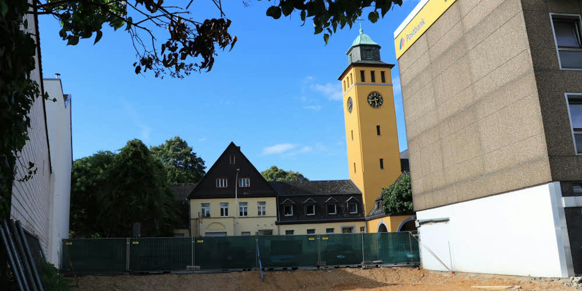 Nach Absprache mit dem Denkmalschutz und mit Einverständnis der Stadt Frechen wird sich der Neubau jetzt zur Hälfte an dem flachen Dach des Postgebäudes und zur anderen Hälfte am Giebel des Altbaus auf der Ecke zur Dürener Straße orientieren, um sich so in die Umgebung möglichst harmonisch einzufügen. Die öffentlichen Parkplätze an der Hauptstraße werden auch vor dem Neubau erhalten bleiben.