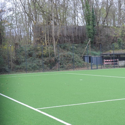 In diese hintere Ecke des Bachemer Sportplatzes verirren sich nur wenige Frechener. Mal kommen Hundehalter vorbei, ab und zu auch Mitglieder des Angelvereins „Hecht Heil“ oder Fußballer, wenn ihr Ball über den Zaun geflogen ist. Der fünf Meter hohen und 80 Meter langen holzverkleideten Backsteinwand, die dort hinter der Sportanlage auf einem Hügel errichtet wurde, schenken sie dann aber kaum einen Blick.