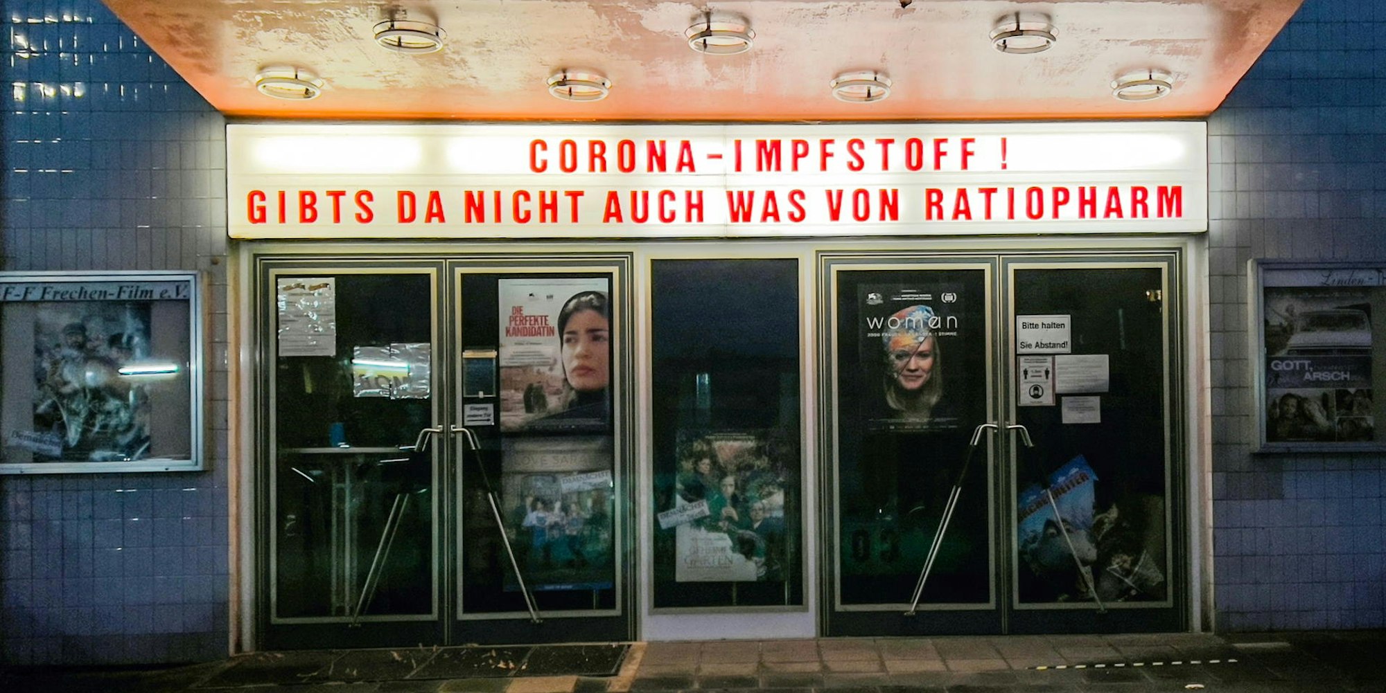 Immer wieder überraschen die Kino-Betreiber mit witzigen Sprüchen auf der Leuchtreklame über dem Eingang der Lichtspielhauses. Im November war dort ein ironischer Abschiedsgruß an den abgewählten US-Präsidenten Donald Trump zu lesen, jetzt nehmen die Kino-Macher den Impfstoff-Mangel auf die Schippe.