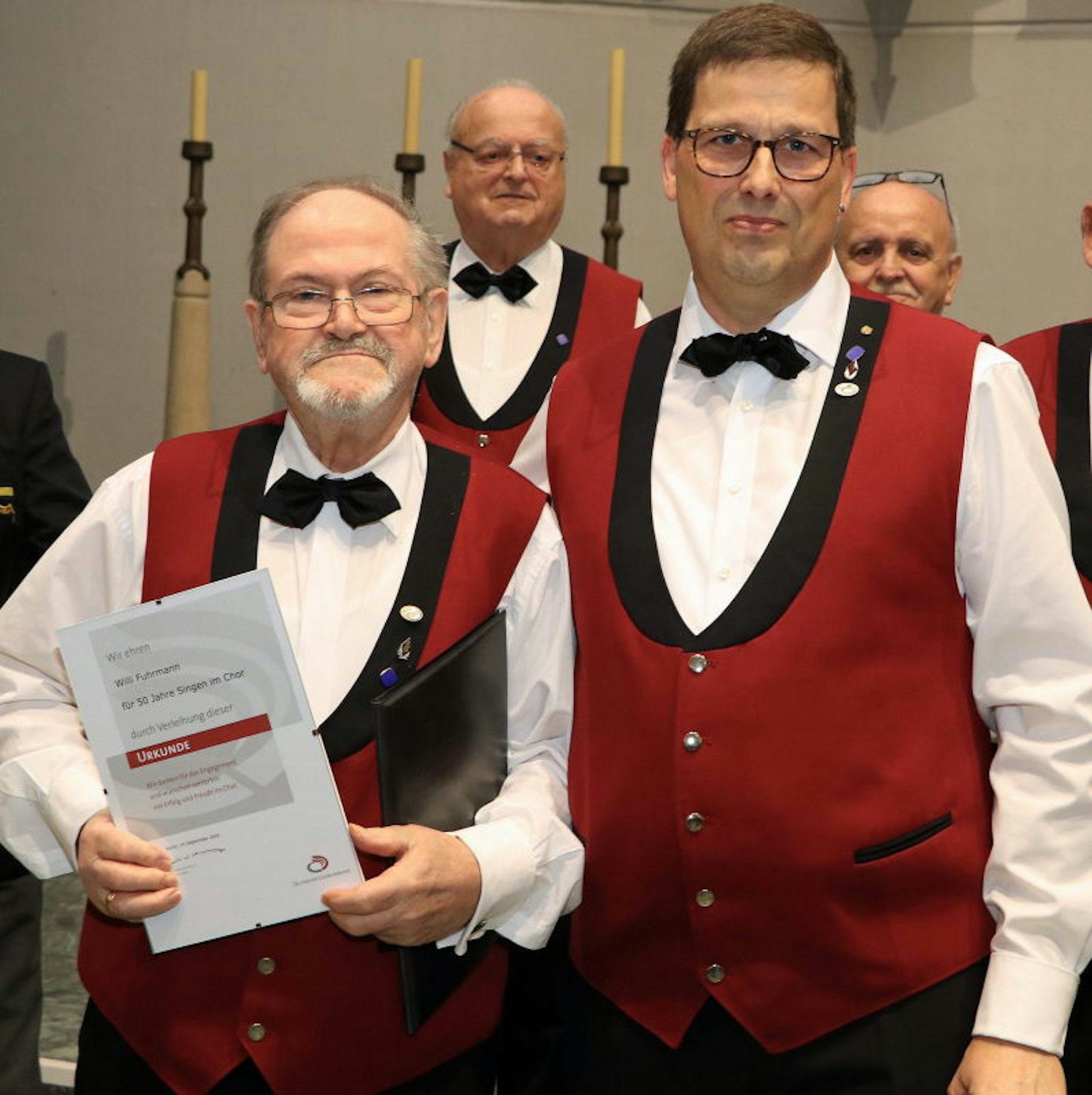 Willi Fuhrmann (l.) erhielt eine Urkunde vom Deutschen Chorverband aus den Händen von Rudolf Schmitz.