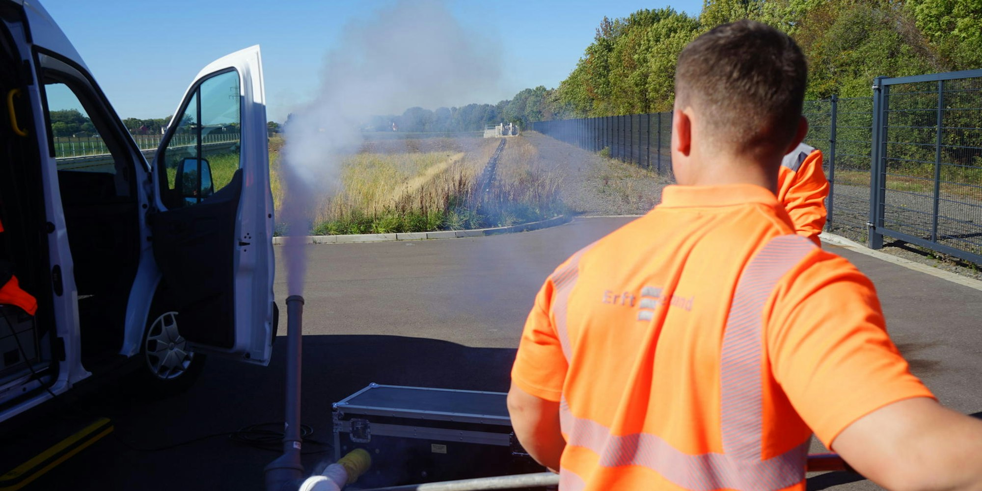Mit einer improvisierten Nebelmaschine überprüfen Abwassertechniker, ob Kanäle oder Rohre verstopft sind. Auch Fehlanschlüsse bei Häusern können sie so entlarven.