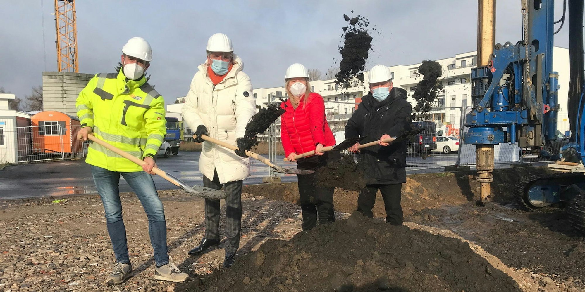 Zur Schaufel griffen die Frechener Bürgermeisterin Susanne Stupp. GWG-Projektleiter Eduard Wagner, Alexander Benning von der mit den Arbeiten beauftragten Firma Celler Grundbau aus Oberhausen und GWG-Geschäftsführer Achim Leirich. Er geht von einer Bauzeit von etwa zwei Jahren aus: „Das ist auf jeden Fall unser Ziel.“