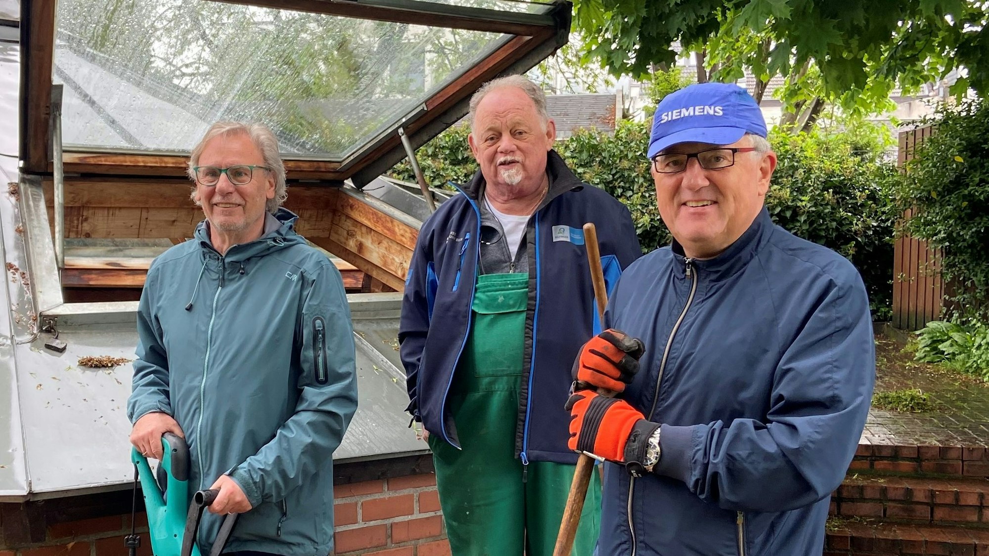 Hubrt Bühr, Hans Wolf und Wolfgang Höfig (v.ln.r.) von der Denkmal AG des Frechener Geschichtsvereins starten die Pflege- und Kontrollarbeiten im Rahmen der Denkmalpatenschaft an den Töpferöfen an der Broichgasse, die der Verein seit 2007 wahrnimmt. Foto: A. Jansen