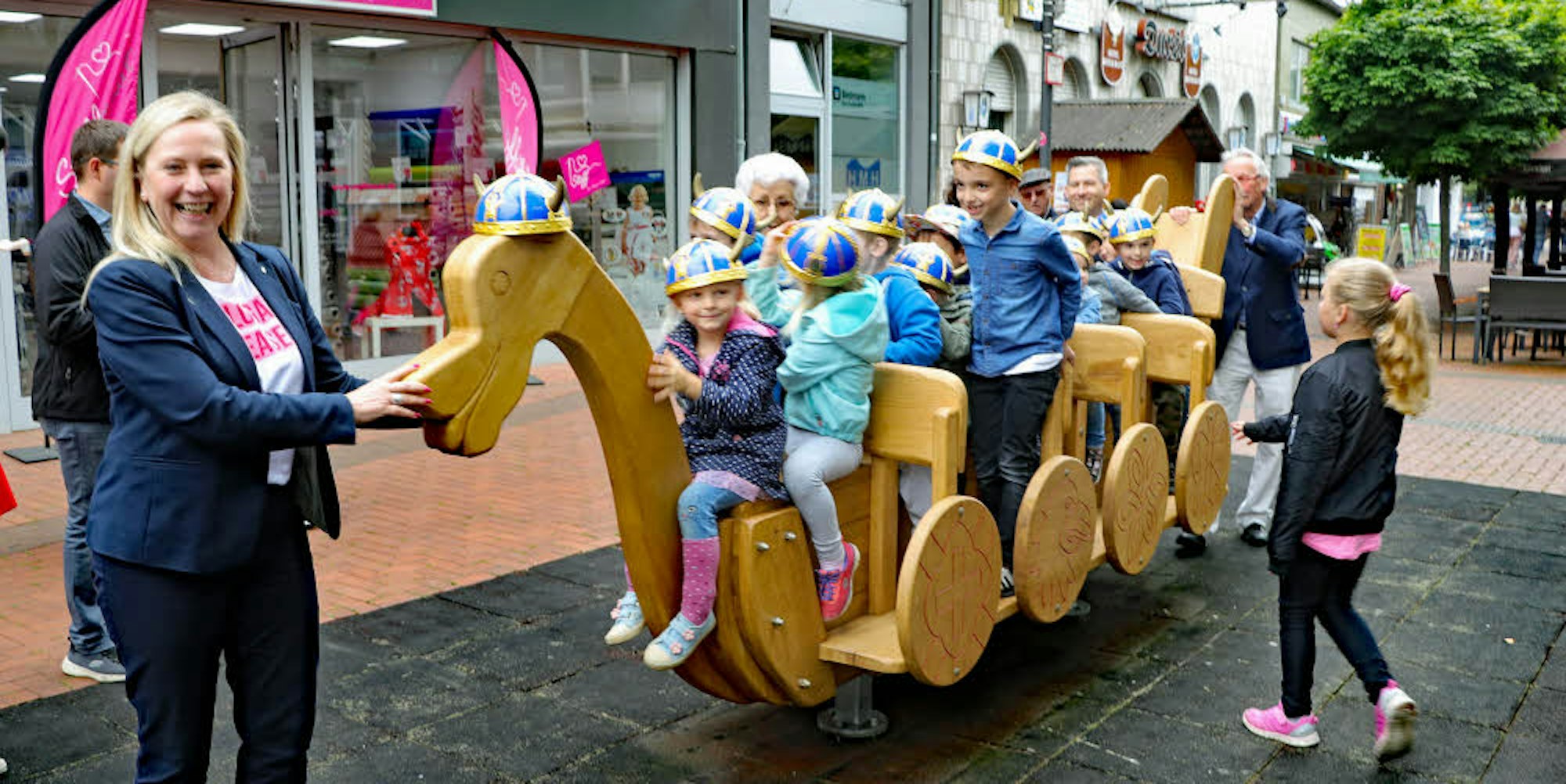 Frechen – Sie ist wieder da, die Wikingerschaukel auf der Frechener Fußgängerzone. Vor mehr als zwei Jahrzehnten wurde sie zur Freude der damaligen Frechener Pänz zwischen dem Spielwarengeschäft Carrié und der Kreissparkassenfiliale aufgestellt.