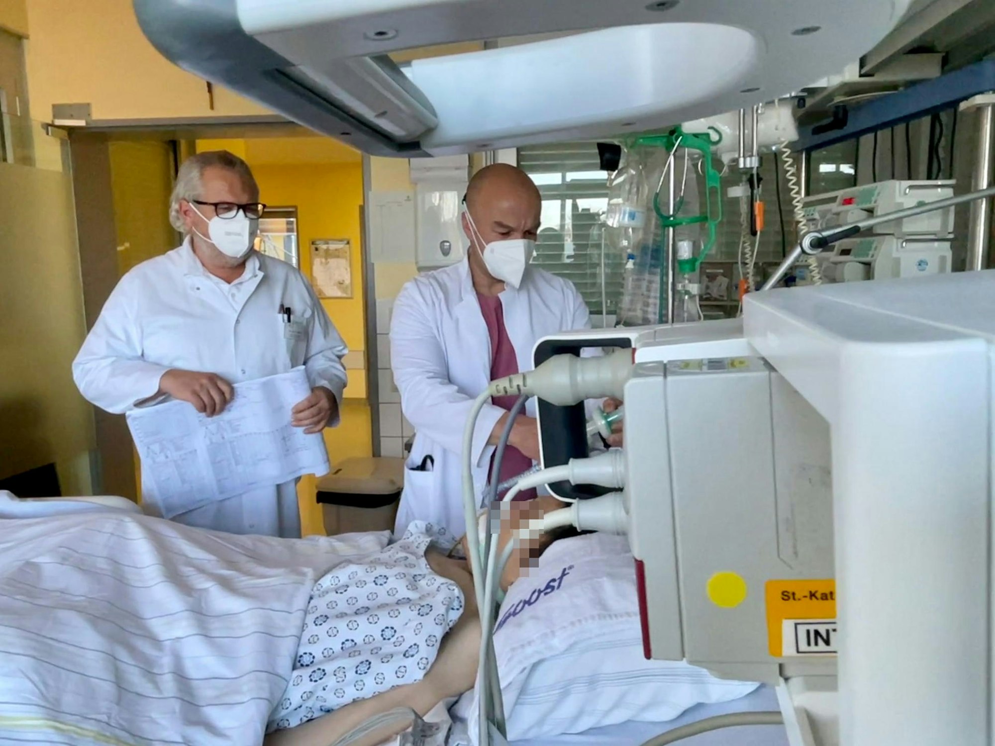 Oberarzt Dr. Thomas Wyderka (l.) und Intensiv-Mediziner Dr. Dorin Goia stehen am Bett eines Corona-Patienten, der schwere Organschäden davon trug.