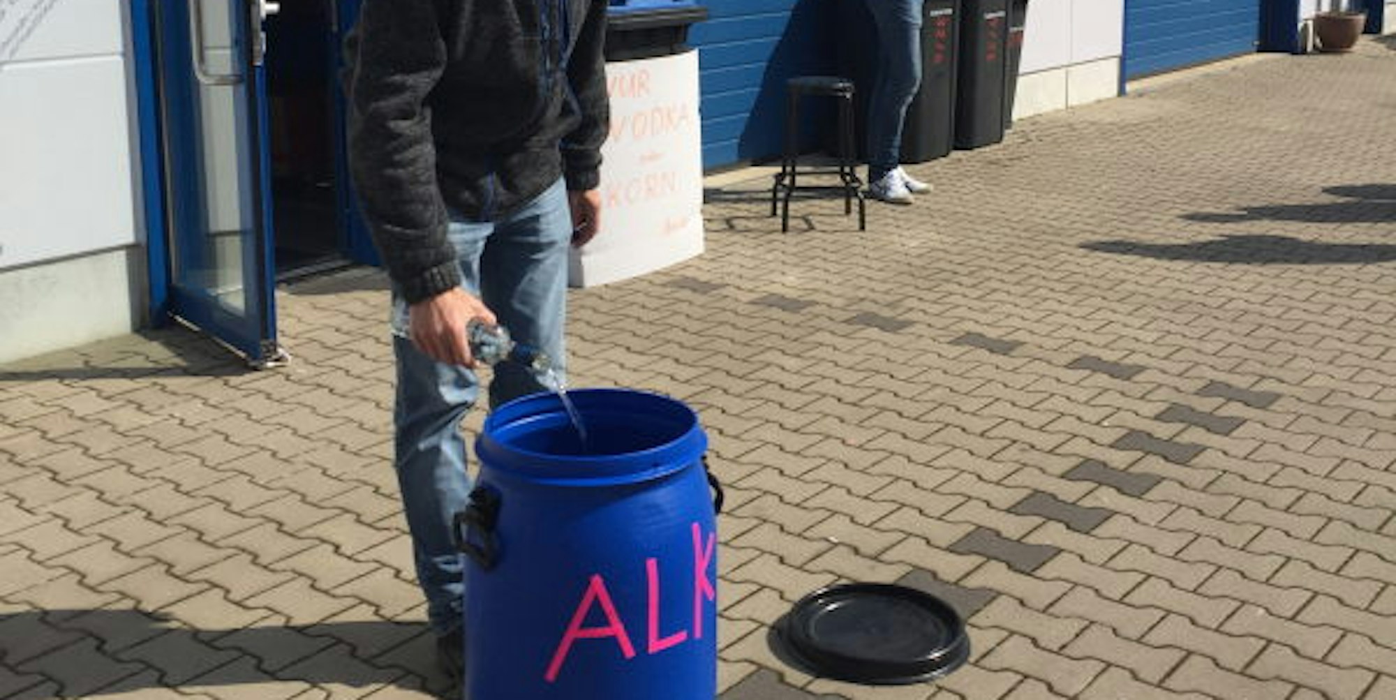 Spendenaktion für DesinfektionDen Schnaps zum Recyclen in die blaue Tonne gekippt