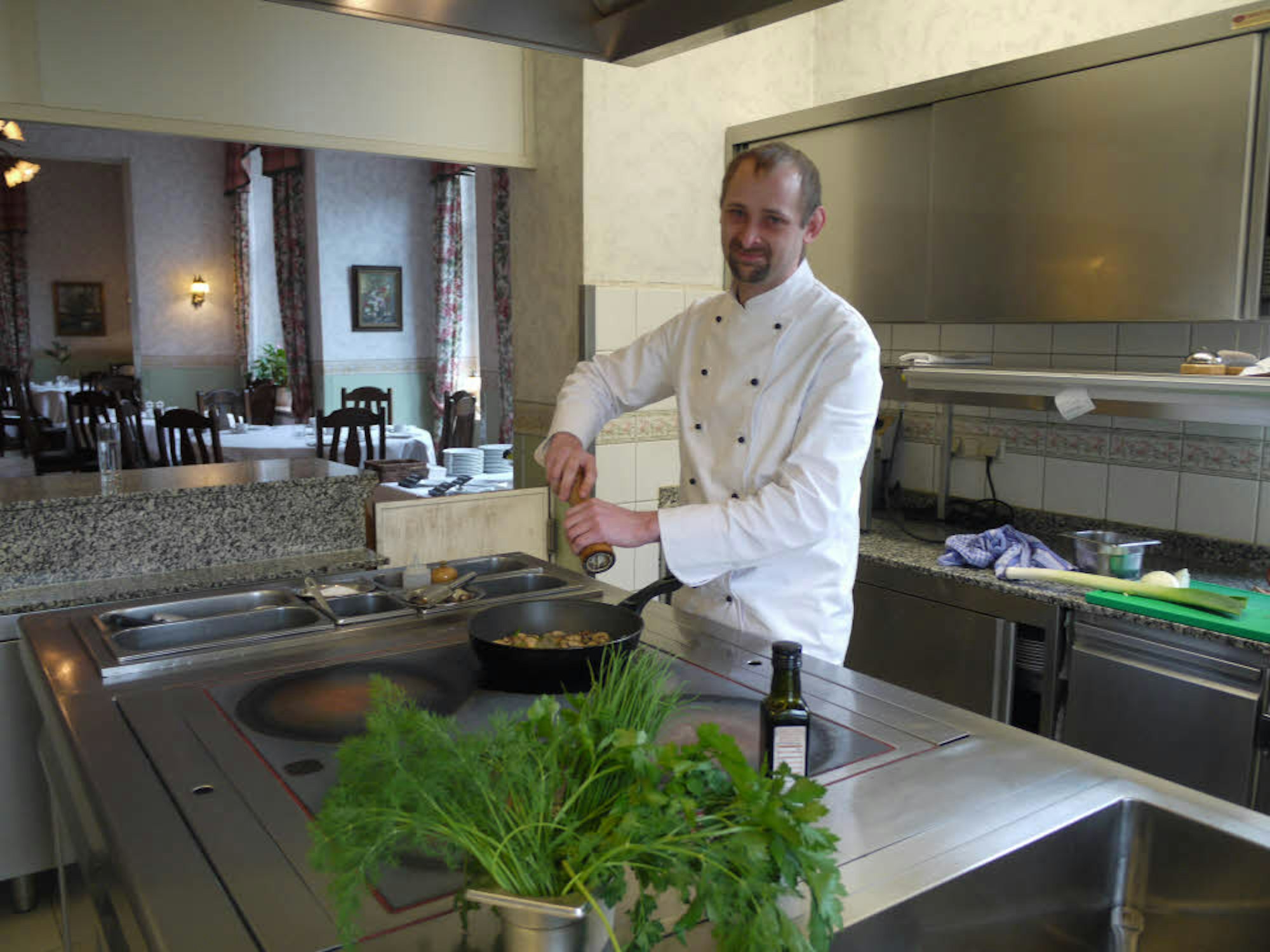 Doch was wären all diese hervorragenden Bedingungen ohne eine gute Küche? Für die Zubereitung ist Chefkoch Björn Melchior verantwortlich. Pilze haben augenblicklich einen hohen Stellenwert. Die Gnocchi zum Beispiel werden mit einer Käse-Steinpilzfüllung und Lauchcremesoße (15,90 Euro) zubereitet und gebratene Serviettenknödel in Pilzrahmsoße (15,30 Euro) serviert. Als Entree bietet sich eine Waldpilzcremesuppe mit Sahnehaube und gerösteten Zwiebeln (5,30 Euro) oder Salat mit Balsamico-Vinaigrette und sautierten Pilzen (12,90 Euro) an. „Ich koche sowohl gern mit Zuchtpilzen als auch mit Pfifferlingen, Steinpilzen und Stockschwämmchen“, sagt Melchior.