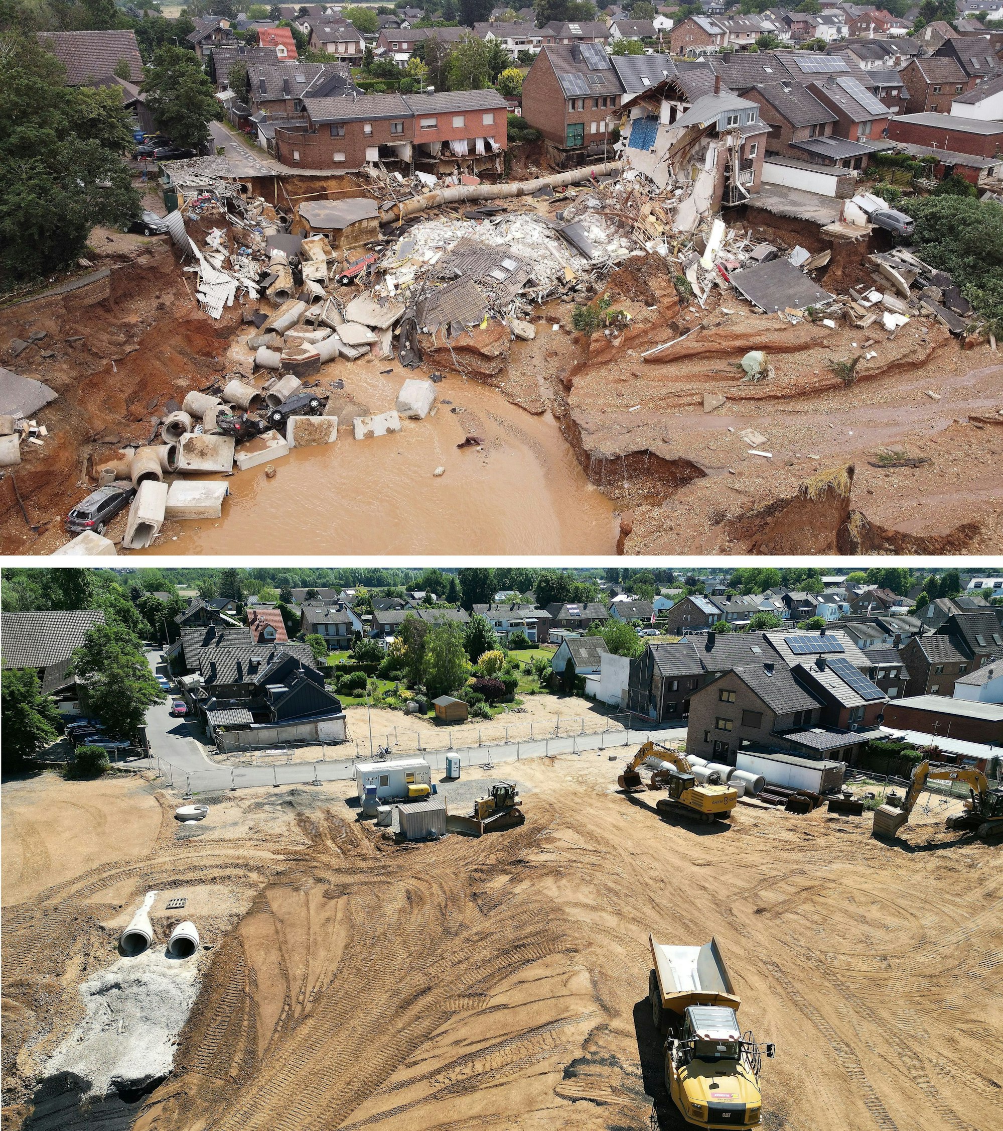 Ein Blick in die Einsturzgrube am 16. Juli 2021 im Ortsteil Blessem kurz nach der Flutkatastrophe (oben). Knapp ein Jahr später (16. Juni 2022, unten) waren an derselben Stelle noch immer die Folgen der Flut sichtbar.