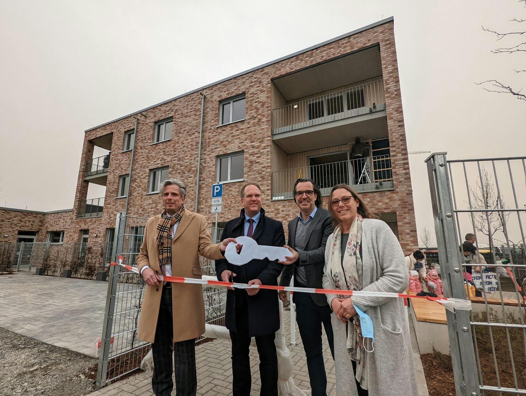 GWG-Geschäftsführer Achim Leirich übergab symbolisch den Schlüssel an den Geschäftsführer des Trägers, Marcus Bracht, und die Kita-Leiterin Marion Kyrion. Educcare mit Sitz in Köln betreibt bundesweit 43 Einrichtungen und eröffnet nun die erste Kita im Rhein-Erft-Kreis.