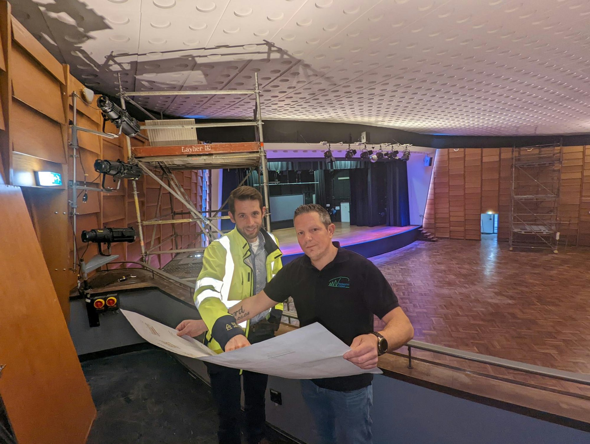 Den Bestuhlungsplan begutachten Teamleiter Christoff Jakobs und Haustechniker Daniel Platen auf der Baustelle im großen Saal.