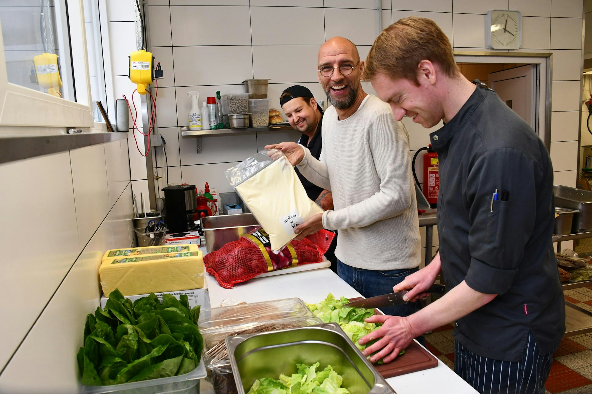 Koch Marcel Bäcker, Walter Schnerring und Produktionsleiter Sebastian Ostlender zeigen, wie in der Küche Speisen vorbereitet werden.