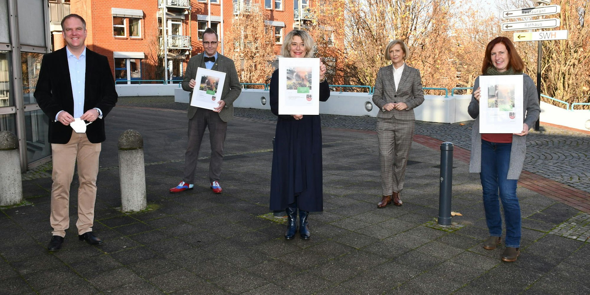 Zum Klimaschutzpreis gratulierten Bürgermeister Dirk Breuer (l.) und Martina Meyer von Westenergie (2.v.r.) den Preisträgern Michael Schumacher (Lions-Club), Birgit Schorn (Grundschule Kendenich) und Daniela Haferkorn (Hauptschule Kendenich).