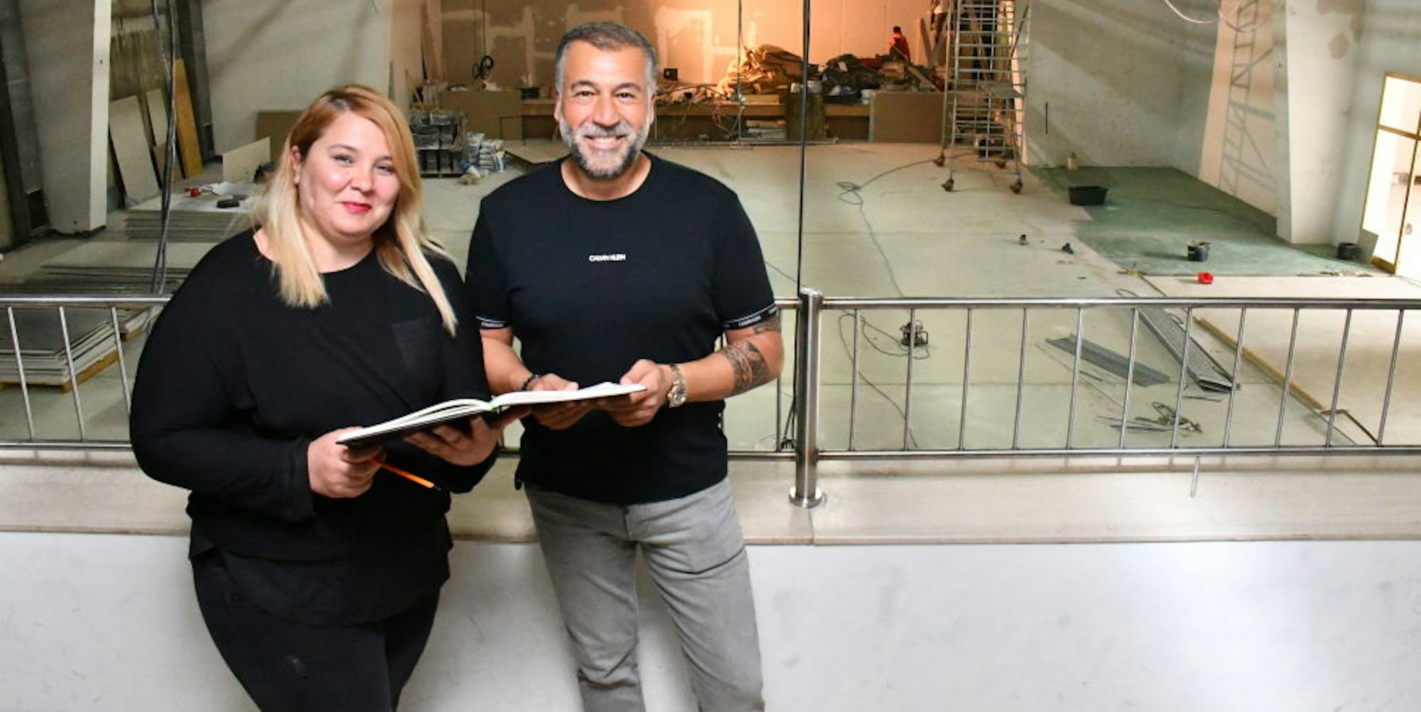 Fortgeschritten sind die Arbeiten im Saal von Haus Burgpark. Ali Aydogdu, hier mit Mitarbeiterin Fatma Sahin, will 2021 eröffnen.
