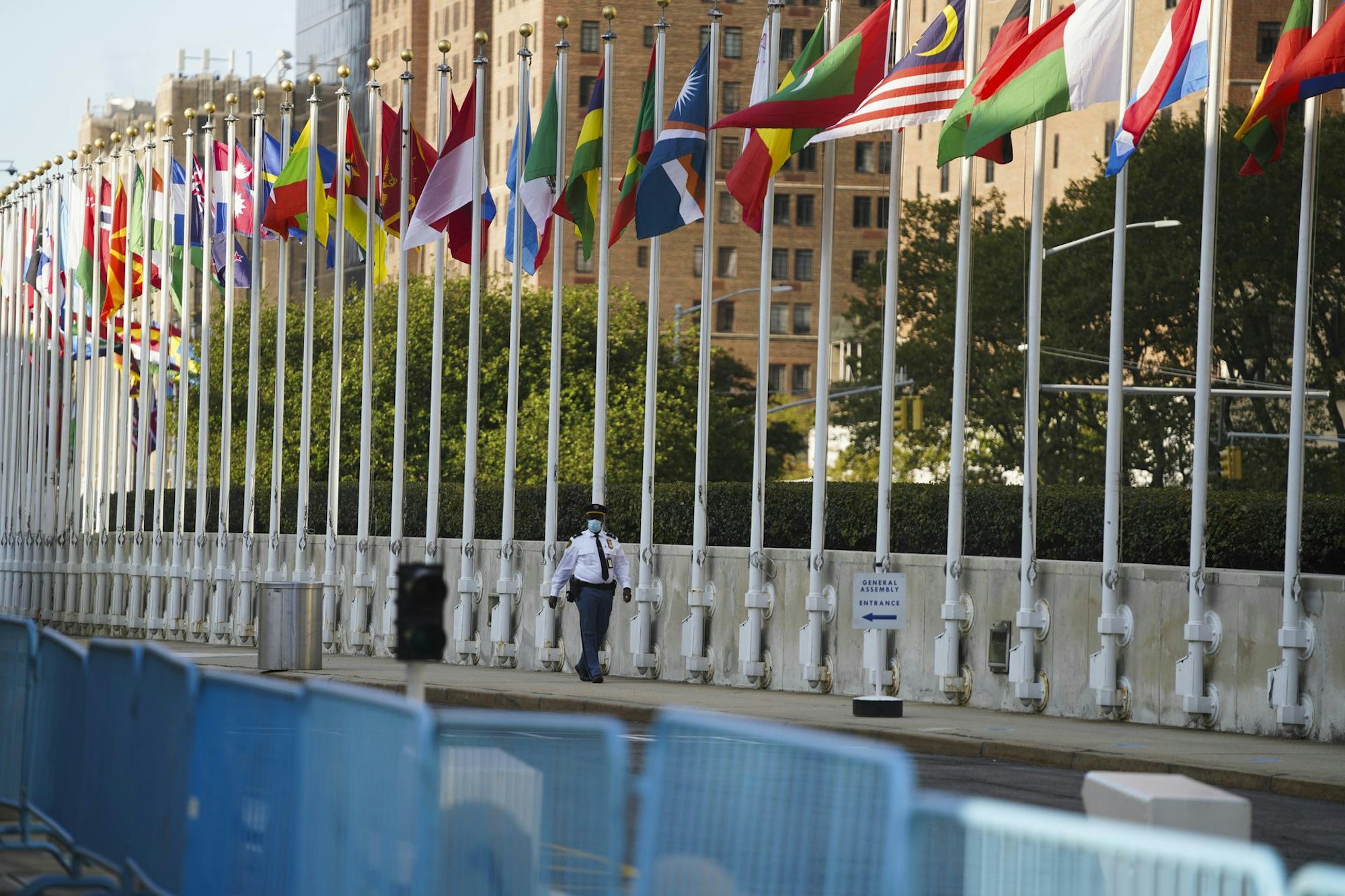Nur die Fahnen der Nationen bewegen sich im Wind. Ansonsten herrscht rund um das UN-Gebäude in New York am Tag des 75-jährigen Geburtstags erschreckende Leere.