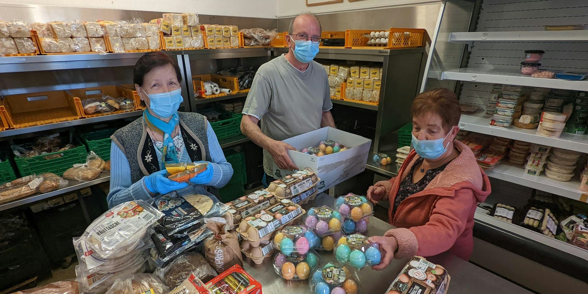 An Waren mangelt es der Tafel nicht. Körbe, Regale und Kühltheke sind gut gefüllt, vor allem mit verderblichen Waren wie Obst und Gemüse, Molkereiprodukten und anderen Lebensmitteln, die kurz vor Ablauf des Haltbarkeitsdatums stehen und von den Händlern sonst entsorgt werden müssten. Zurzeit können die Tafel-Mitarbeiter auch Süßigkeiten und gefärbte Ostereier in die Einkaufstaschen packen, die in den Supermärkten gerade ausgeräumt worden sind.