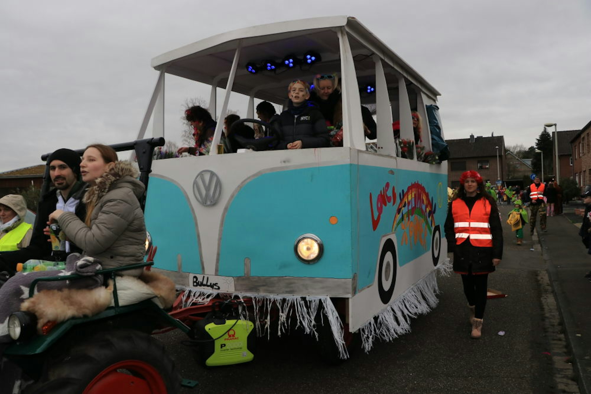Erinnerungen an Woodstock weckte der MC Muffin mit seinem großen VW-Bully in Grefrath. Hübsch verpackt waren die beiden jungen Frauen im Grefrather Zug.