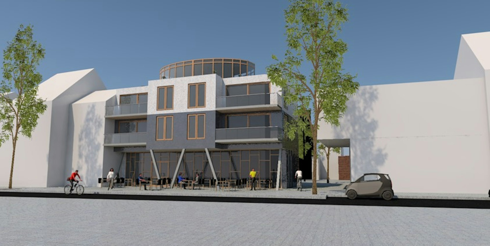 Der Entwurf zeigt Gastronomie vor dem Gebäude. Ein Biergarten hinter dem Haus stieß bei Nachbarn auf Widerstand.