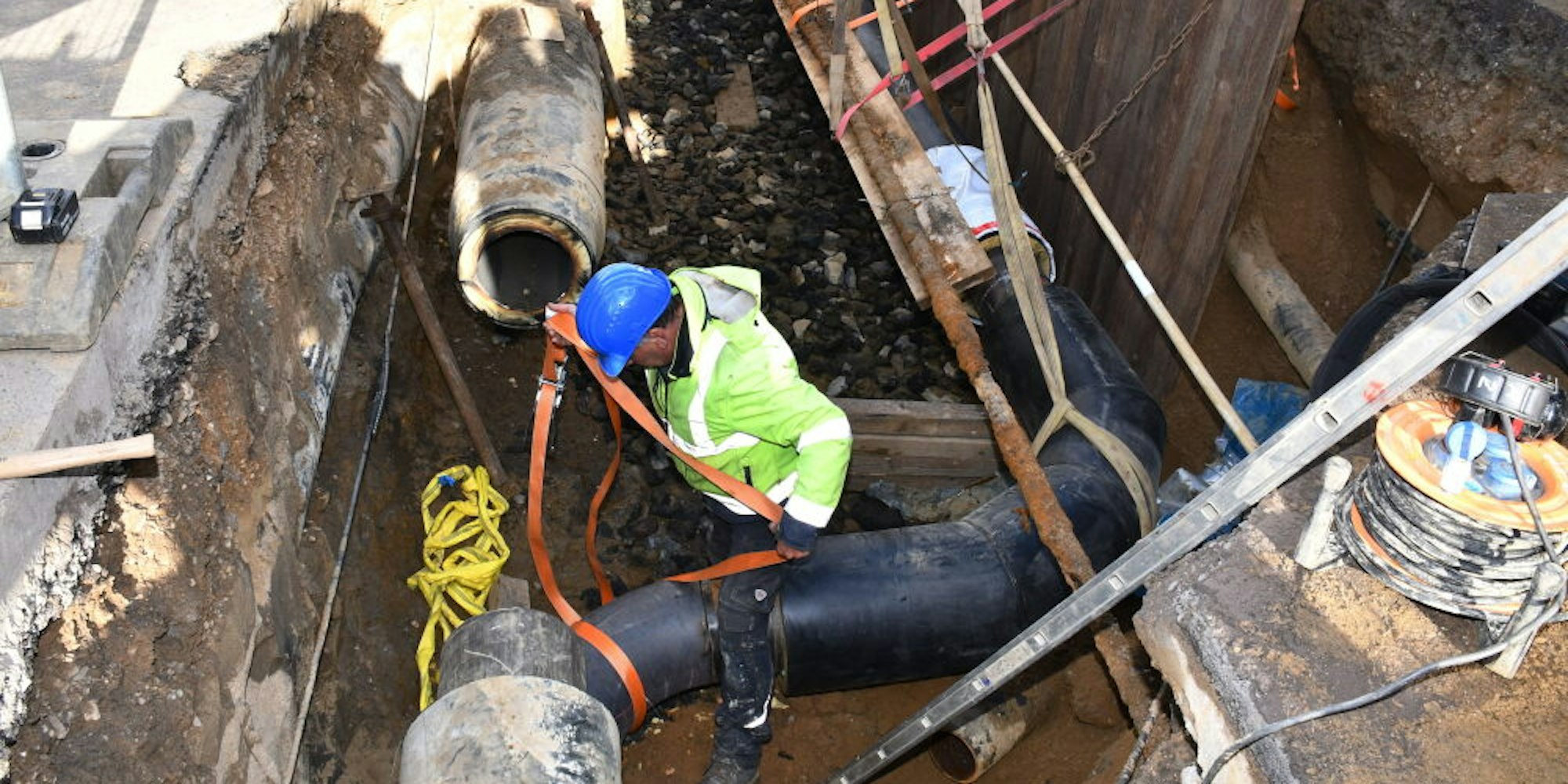 Auch für Bauleiter Francesco Calio von der Leitungsbaufirma Pierenkemper aus Frechen war es eine nicht alltägliche Baustelle. „Es ist schon eine Herausforderung, ein neun Meter langes, eine Tonne schweres Rohrstück in U-Form in einer engen Baugrube zwischen vielen Fremdleitungen einzufädeln und zu verschweißen“, schildert der Experte. Zumal es beim Rohrbruch schnell gehen müsse und die Baustelle nicht lang planbar sei.