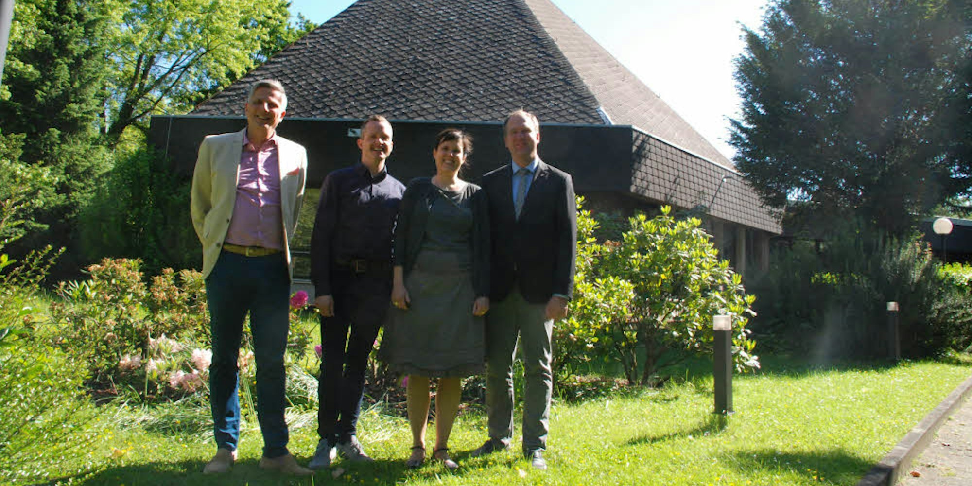 Den Standort des Glockenturms besichtigen Achim Leirich (GWG), Presbyter Manuel Busch, Pfarrerin Christian Birgden und Bürgermeister Dirk Breuer (l.).