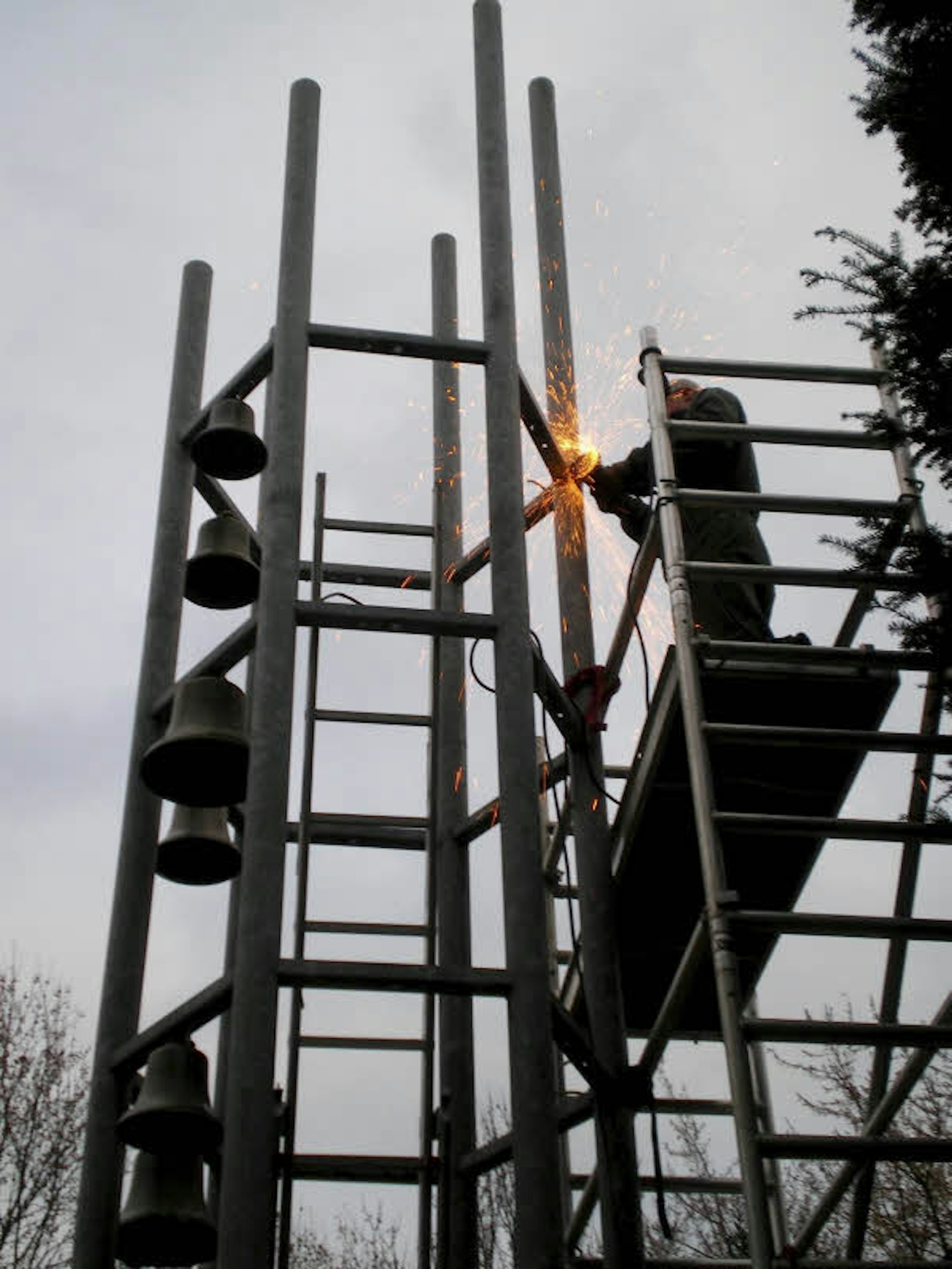 Im Januar wurde der markante, sieben Meter hohe Stahlturm mit den 18 Glocken abgebaut. Er wird demnächst durch einen fast doppelt so hohen Turm ersetzt, in dem künftig sogar 34 Glocken über drei Oktaven erklingen werden.
