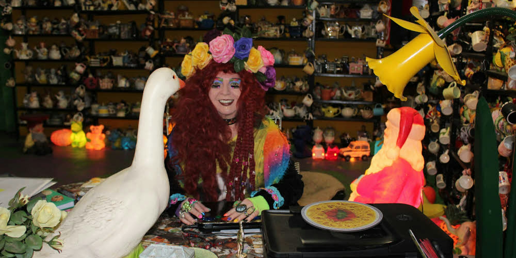 Jeden Tag fährt sie von der Kölner Innenstadt nach Hürth. Der Raum, üppig mit Plastikpalmen, Lichterketten und einem riesigen Buffet mitsamt Attrappen von Esswaren ausgestattet, ist Atelier, Büro, Denkfabrik und Kreativlabor in einem. Der bunt geschmückte Weihnachtsbaum gehört ebenso zum Inventar wie ihre umfangreiche Sammlung origineller Teekannen und Tassen, die in wandfüllenden Regalen aufgereiht sind, und zwei der lebensgroßen „Trash People“, mit denen H.A. Schult weltweit berühmt wurde.