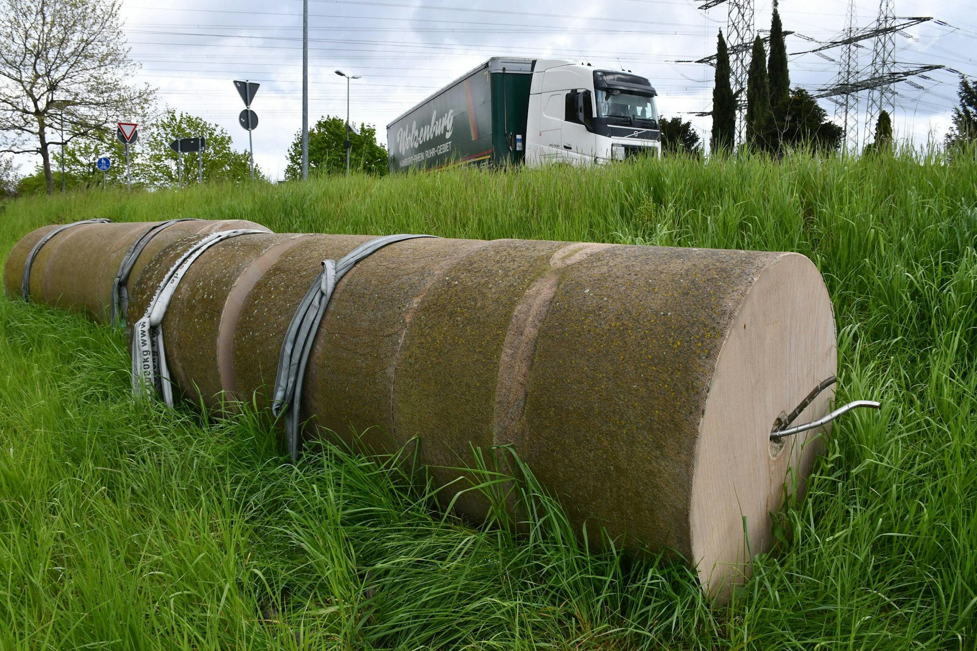 Seitdem liegt die zehn Tonnen schwere Steinsäule zerteilt auf einem Acker vor dem Kreisel. Wann der Stein wieder aufgerichtet werden kann, ist unklar. Klar ist: Es wird richtig teuer.