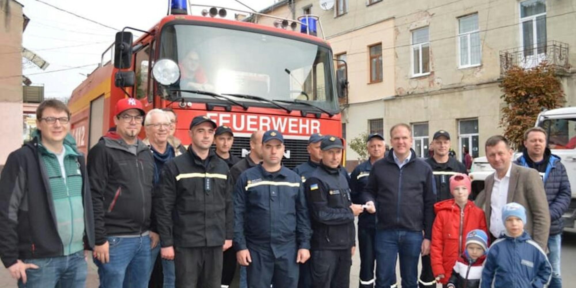Ein Feuerwehrfahrzeug brachte Bürgermeister Dirk Breuer seinem Amtskollegen Oleksandr Zozuly (2.v.r.) mit.