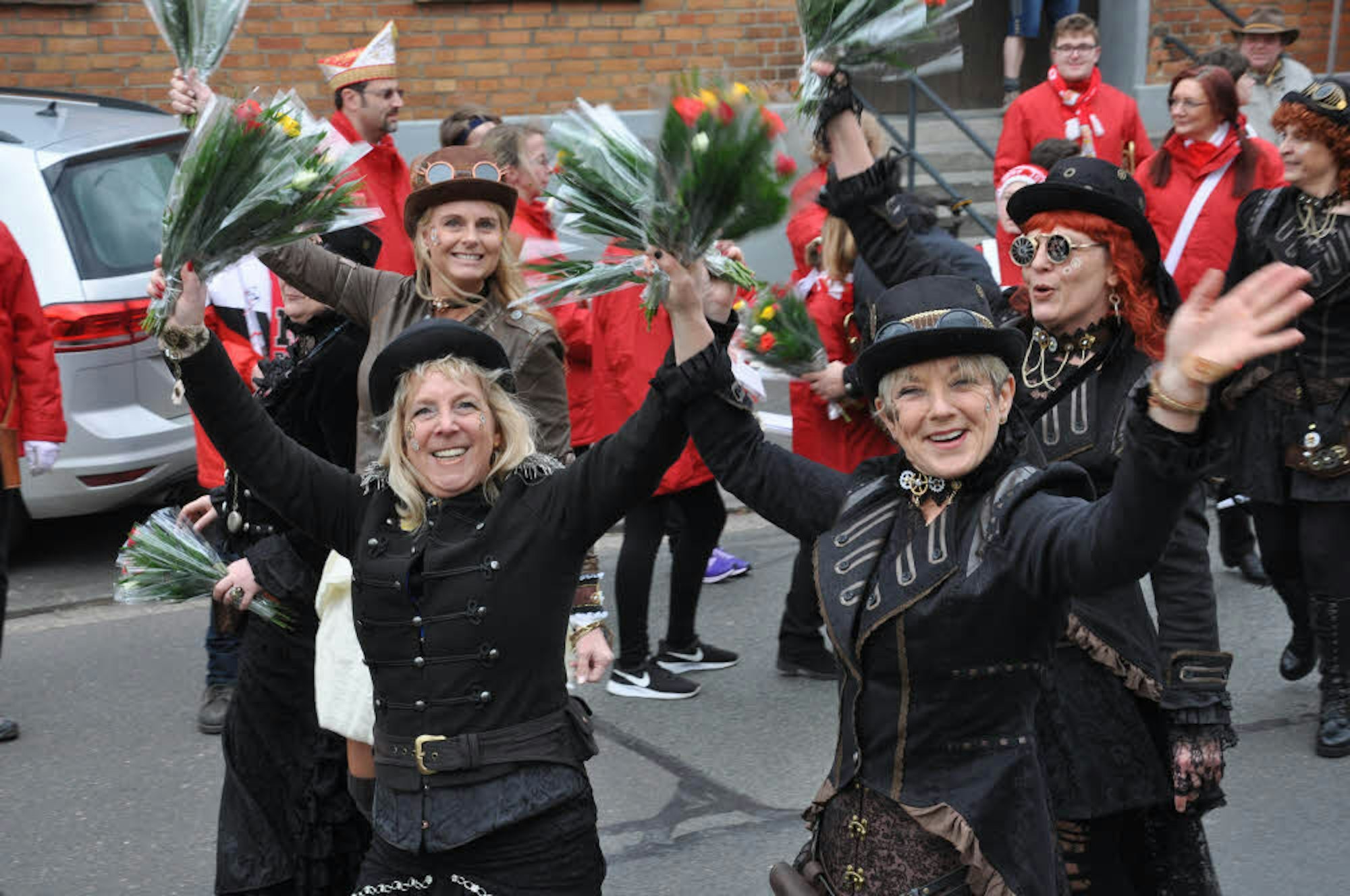Die feierfreudigen Närrinnen des „Ruude Club“ sorgten vor der Mannschaft der Karnevalsgesellschaft Brav Jonge für ausgelassene Stimmung in Kierdorf. Sie verteilten auch farbenfrohe Strüßjer an die Narren am Straßenrand.