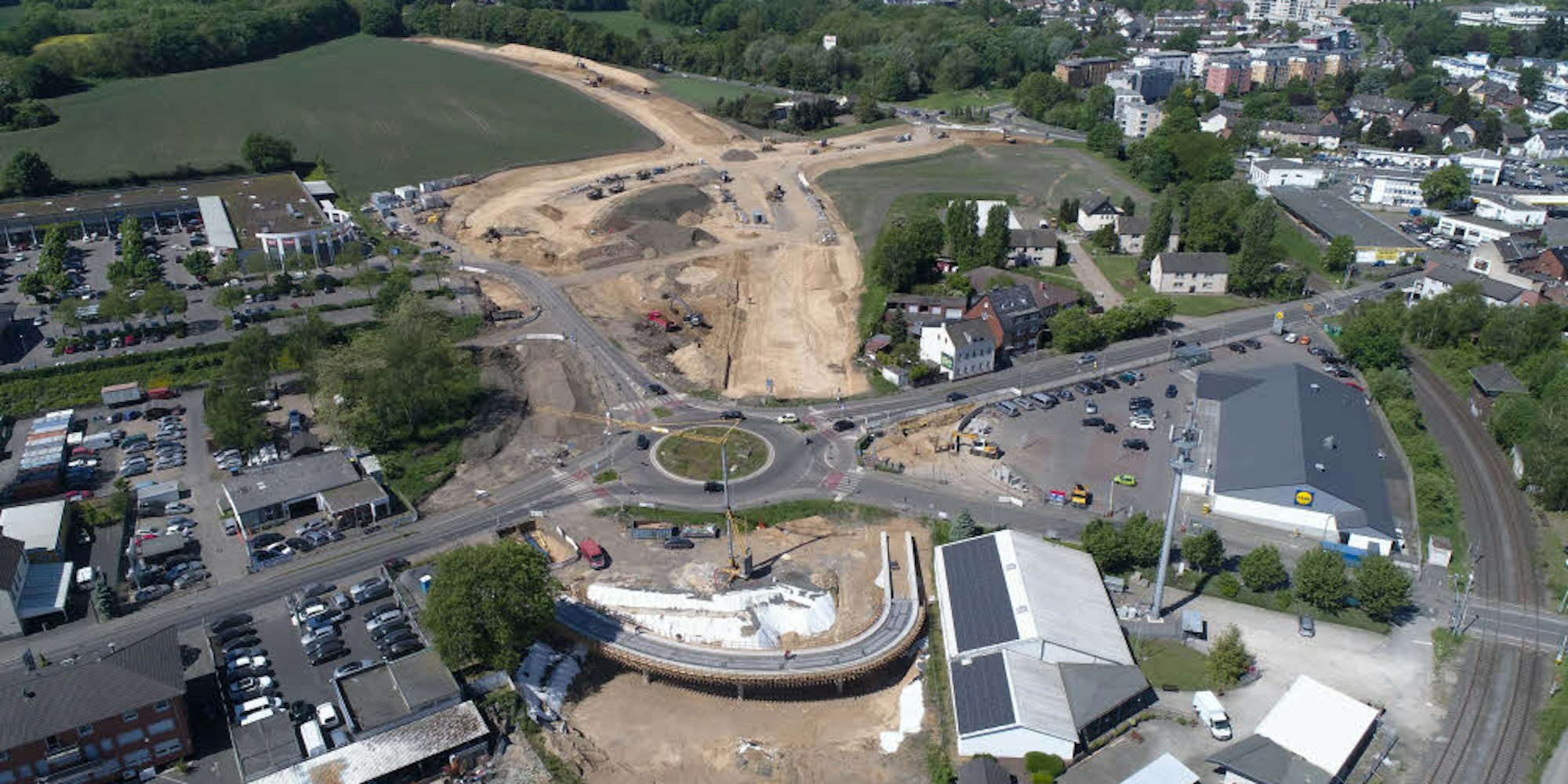Weit vorangeschritten ist der Ausbau am Fachmarktzentrum an der Bonnstraße. Das Luftbild entstand Ende Mai.