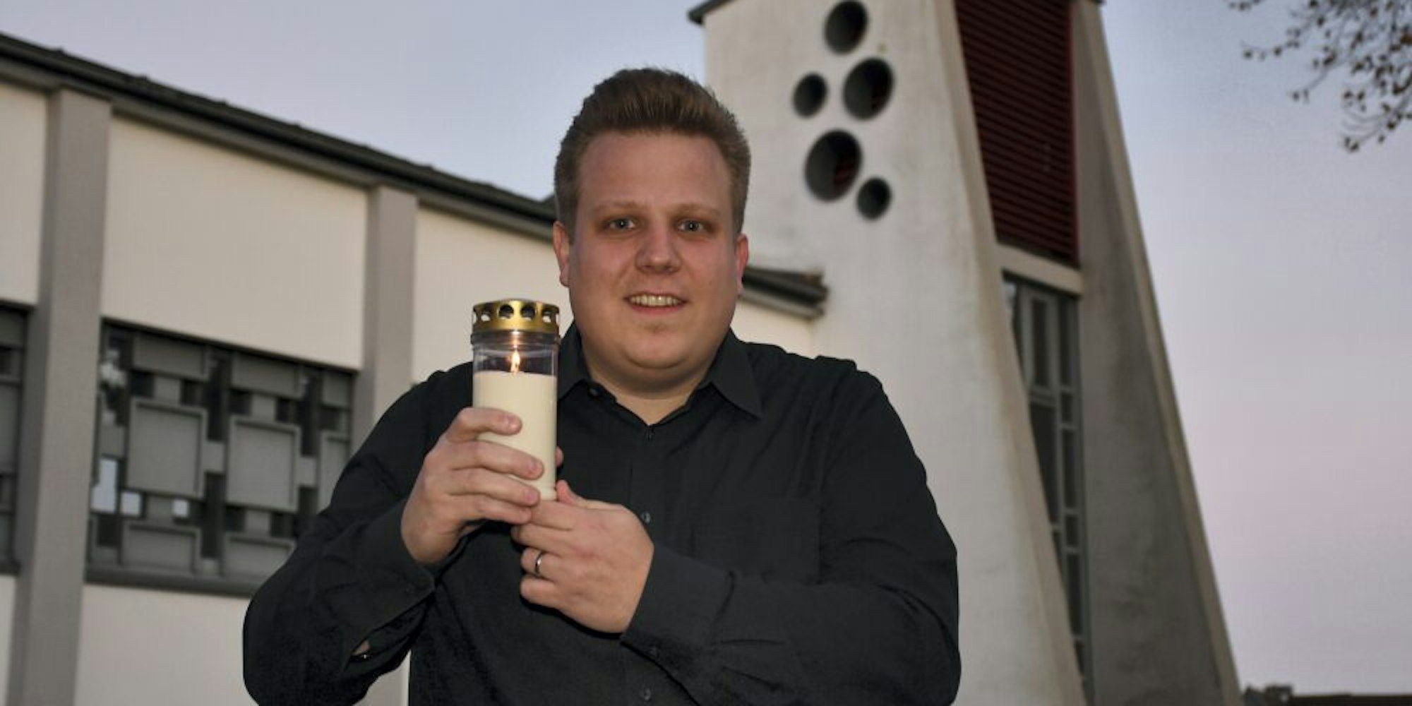 Auf der Wiese vor der Martin-Luther-Kirche in Hürth-Gleuel wird Pfarrer Jan Ehlert für jeden Verstorbenen aus der Gemeinde in diesem Jahr ein Licht entzünden.