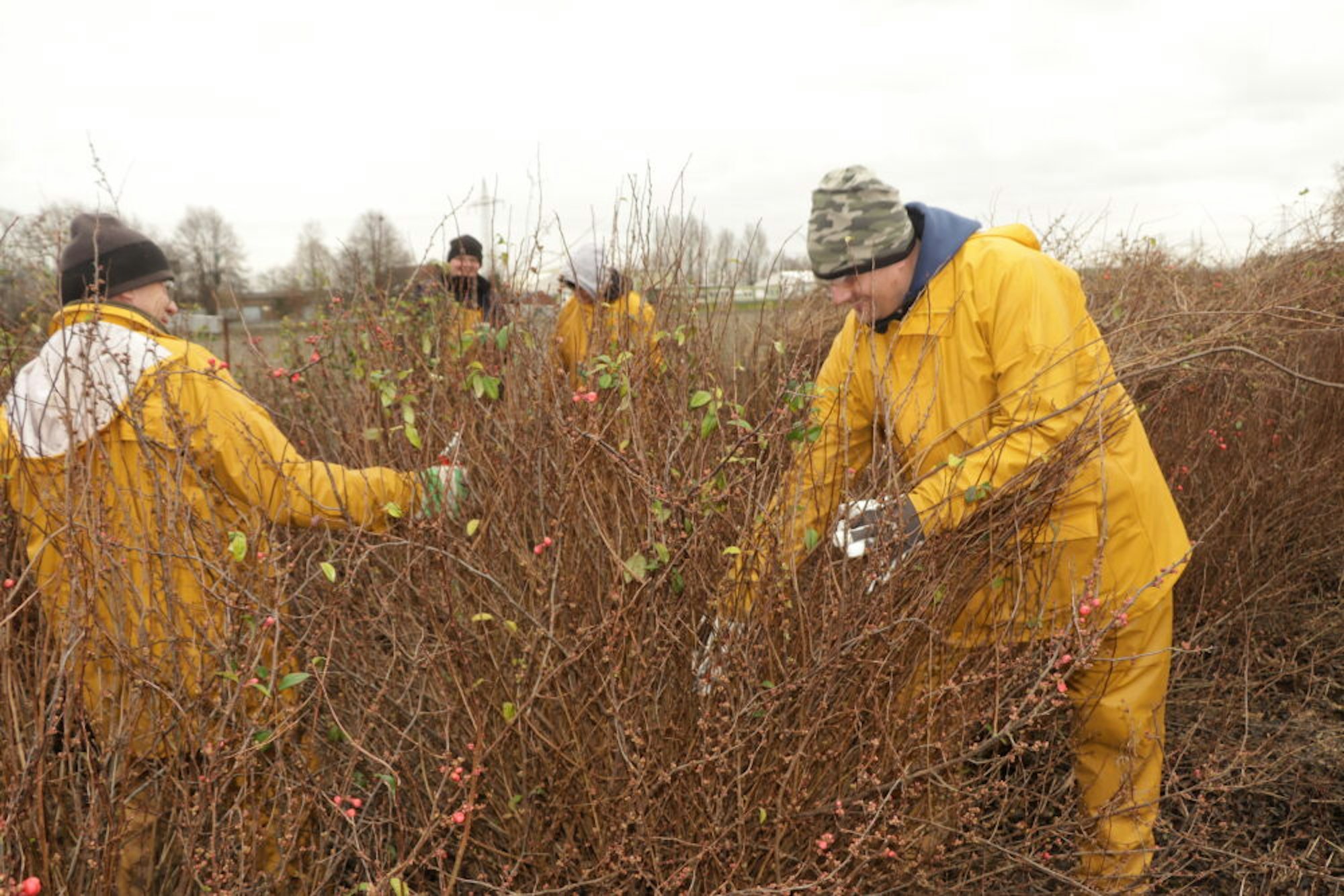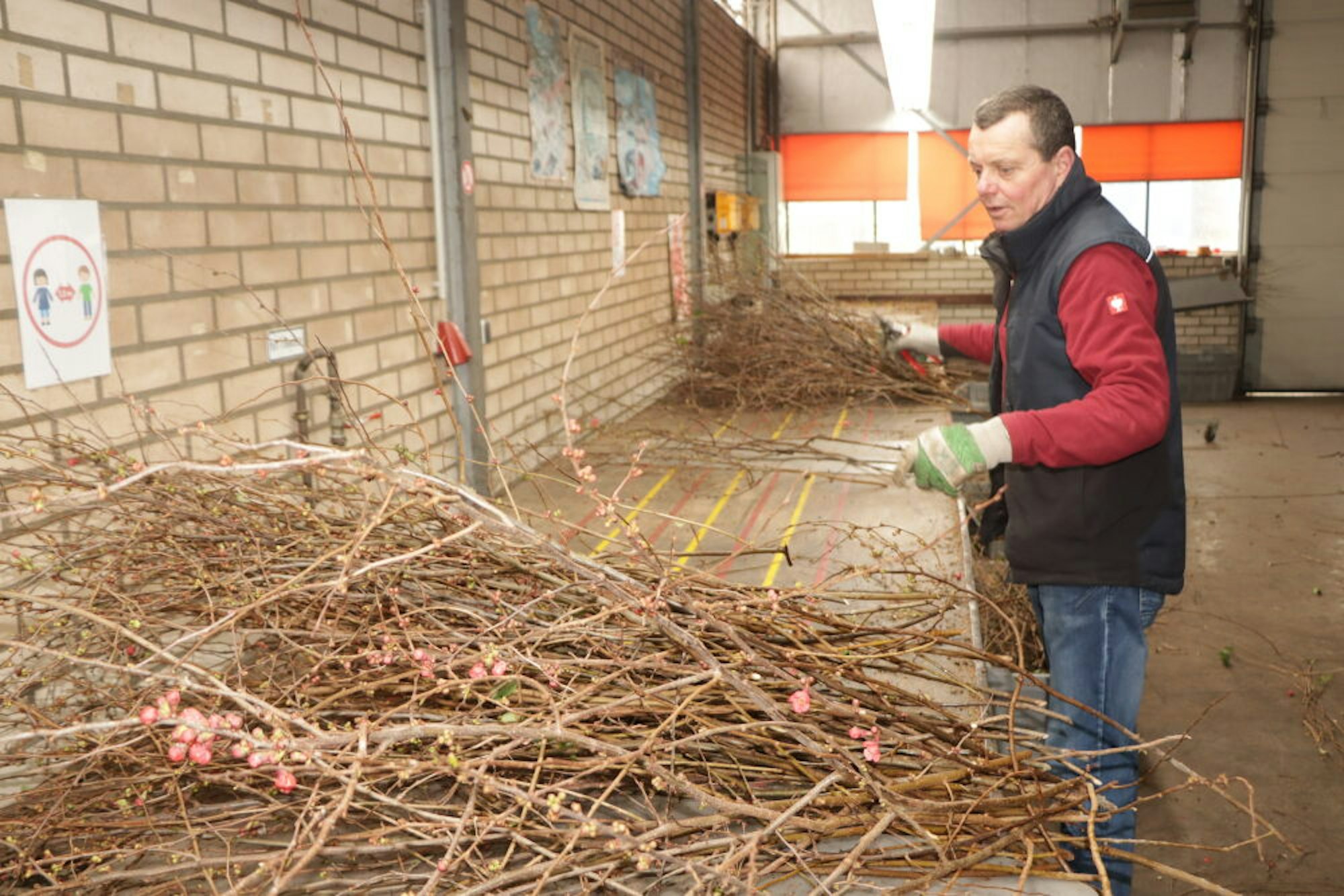 Um Verletzungen vorzubeugen, lässt Kreuzberg seine Mitarbeiter nur in Schutzkleidung mit dicken Arbeitshandschuhen und Schutzbrillen an die Hecken. In seiner Verarbeitungshalle werden die Zweige anschließend sortiert, auf Länge geschnitten und gebunden. „Damit die Sträuße lange in der Vase frisch bleiben, werden die Stiele am unteren Ende fünf bis sechs Zentimeter längs eingeschnitten“, sagt er. Gleichzeitig würden auch die Dornen dabei bis auf eine Höhe von etwa 30 Zentimetern vom Stiel entfernt. „Wir haben rote und weiße Zierquitten im Anbau“, sagt Kreuzberg. Seit einigen Jahren beobachtet der Gärtnermeister allerdings, dass seine Zierquitten schon im Februar zunehmend auch im Freiland in die Blüte treiben.