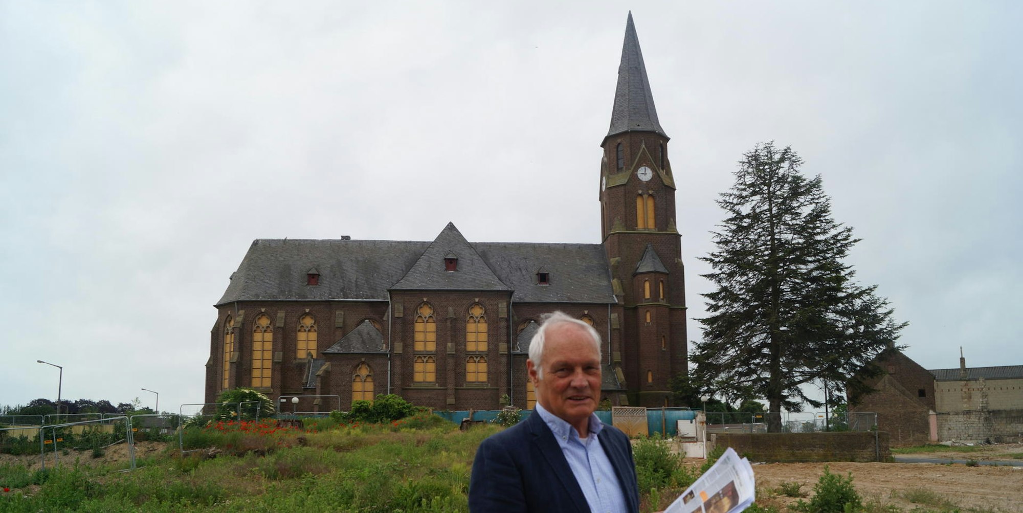 So fehlt etwa das Turmkreuz, auch sind die Fenster mit Holzplatten verrammelt. „Hoffentlich sind wenigstens die Scheiben noch drin.“ Auch ist das Dorf größtenteils schon dem Erdboden gleichgemacht worden. Doch Schlömer glaubt, dass sich das Kirchengebäude und seine Umgebung für Bestattungszwecke wieder herrichten ließe. „Ein paar Bäume drum gepflanzt, dann ergibt das einen tollen Anblick.“
