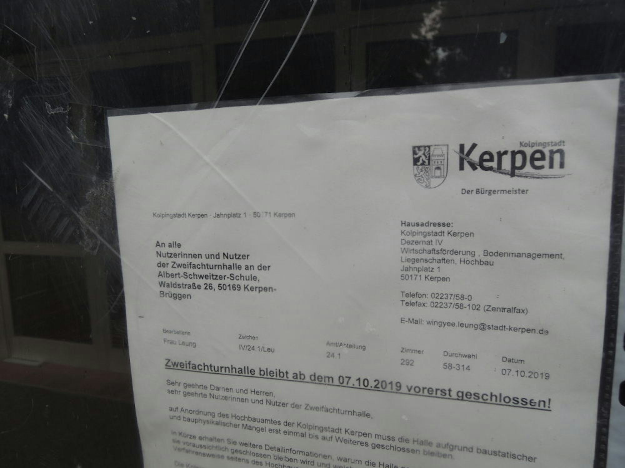 Am Halleneingang informiert die Kerpener Stadtverwaltung darüber, dass die Turnhalle geschlossen werden musste.