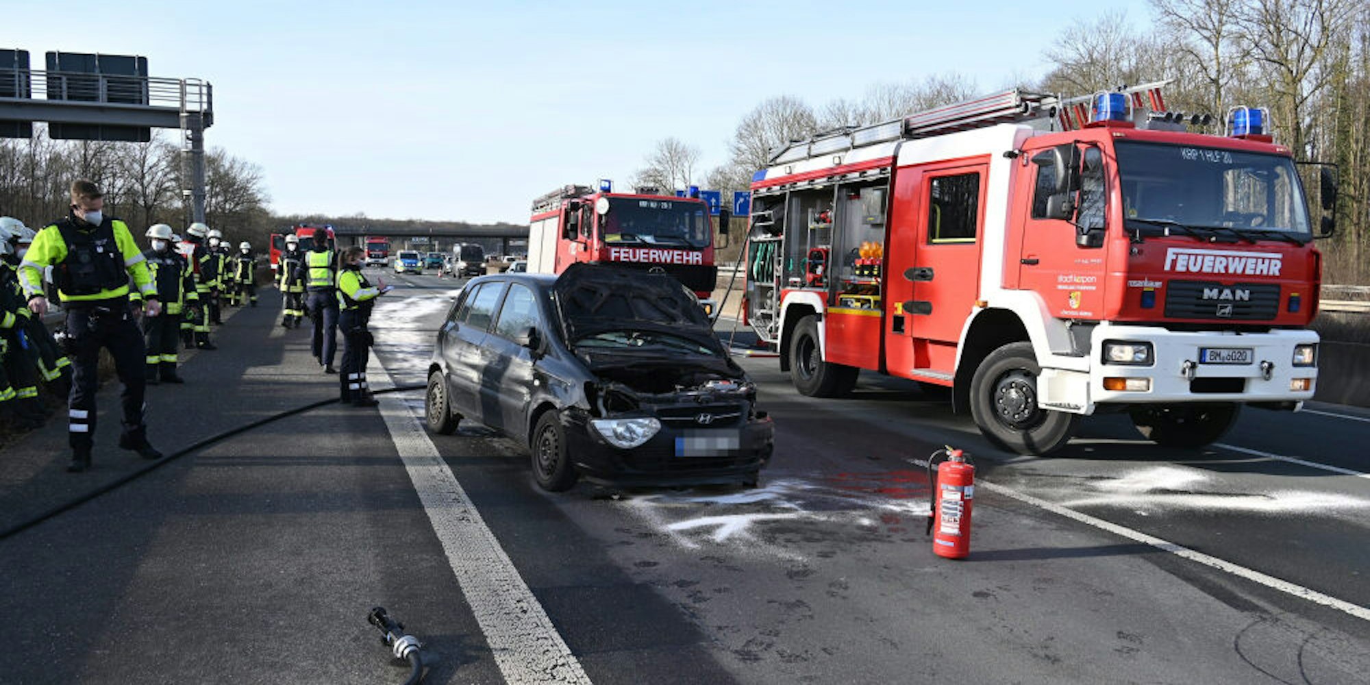 Die Mitarbeiter der Feuerwehr Kerpen rückten mit mehreren Fahrzeugen aus. Die beiden Autoinsassen wurden vom Rettungsdienst und dem Notarzt behandelt. Nach einer Erstversorgung an der Unfallstelle wurden die Verletzten ins Krankenhaus gebracht. Die Polizei hatte mehrere Fahrspuren in Richtung Köln gesperrt. Den Verkehr leiteten die Beamten über den Standstreifen und über die Verteilerfahrbahnen des Autobahnkreuzes an der Unfallstelle vorbei.