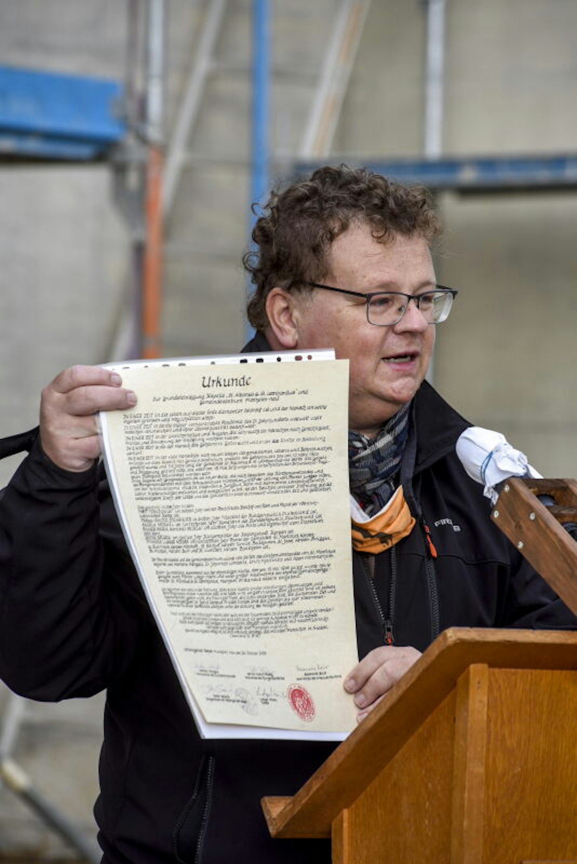 Weithin sichtbar erhielt auch der alte Grundstein der ehemaligen Manheimer Kirche seinen Platz in der Kapelle. Marlene Mengels, Erich Mysliwietz und Albert Memmersheim vom Kirchenvorstand setzten die Grundsteinlegung für die laufenden Kameras in Szene. Ein Grundstein, dessen Urne Pfarrer Ludger Möers und Lonie Lambertz füllten mit Gründungsurkunde, Fotos von Erstkommunion, dem letzten Ehejubiläum oder Taufe in der Kirche St. Albanus und Leonhardus, einem Text- und Liederheft und Pfarrbrief.