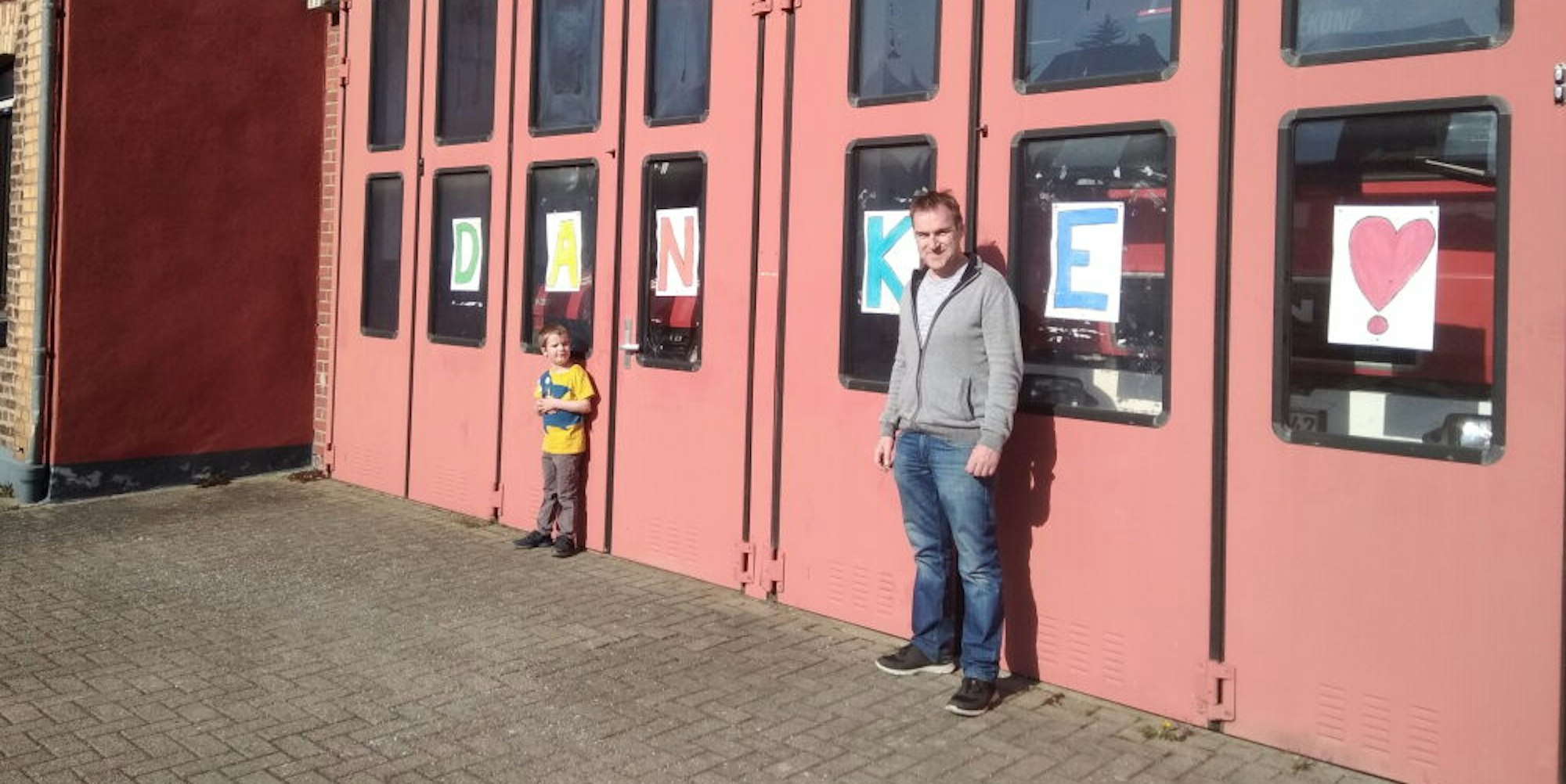 Ein paar Tage später fuhren wir mit dem Auto in Horrem an einem Seniorenzentrum vorbei und sahen, wie sich Feuerwehrfrauen und -männer auf offener Straße umzogen. Auch hier musste ich wieder viel erklären, wieso sie sich nicht auf der Wache umziehen, warum sie sich überhaupt umziehen. Da kam ihm die Idee, das Danke-Schild doch bei der Feuerwehr aufzuhängen.