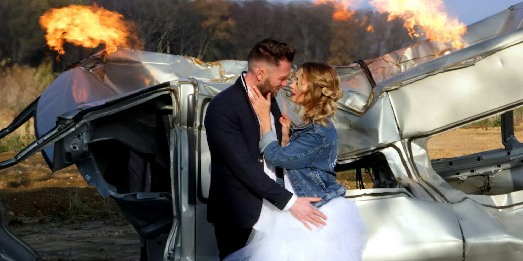 Foto vor einem Autowrack: Dimitri und Romina hoffen, ihre Hochzeit in besseren Zeiten nachholen zu können.