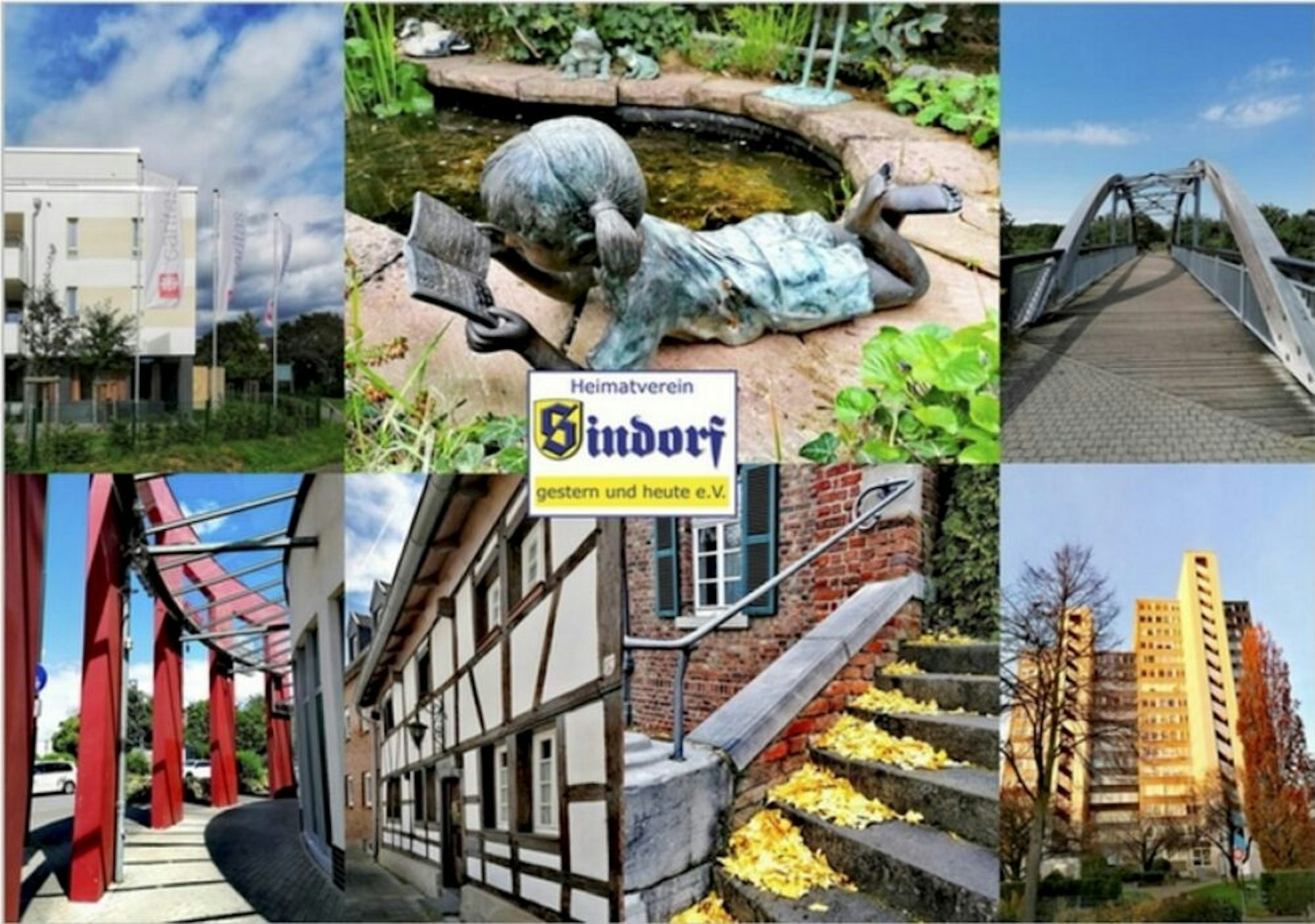 Schnell waren Sindorfer Motive gefunden, die um „das Mädchen, das in der Geschichte Sindorfs liest“, zu einer Collage arrangiert wurden. Das Seniorenheim St. Ulrich ist zu sehen, die Holzbrücke im Vogelrutherweg, das Fachwerkhaus in der Ulrichstraße, Treppenstufen vor der Kirche St. Ulrich, die Arkaden am Marga-und-Walter-Bollplatz und die Hochhäuser am Platz der Integration.