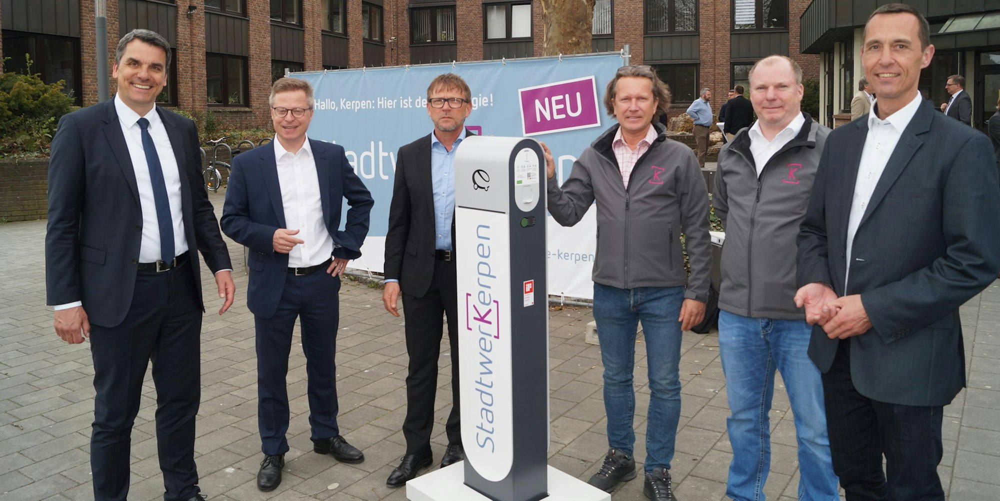Am Start: Stadtwerke-Geschäftsführer Michael Stangel, Markus Wagner und Siegbert Kobus (Technik), die Vertriebsmitarbeiter Jürgen Kohn und René Zander sowie Bürgermeister Dieter Spürck (v. l.)
