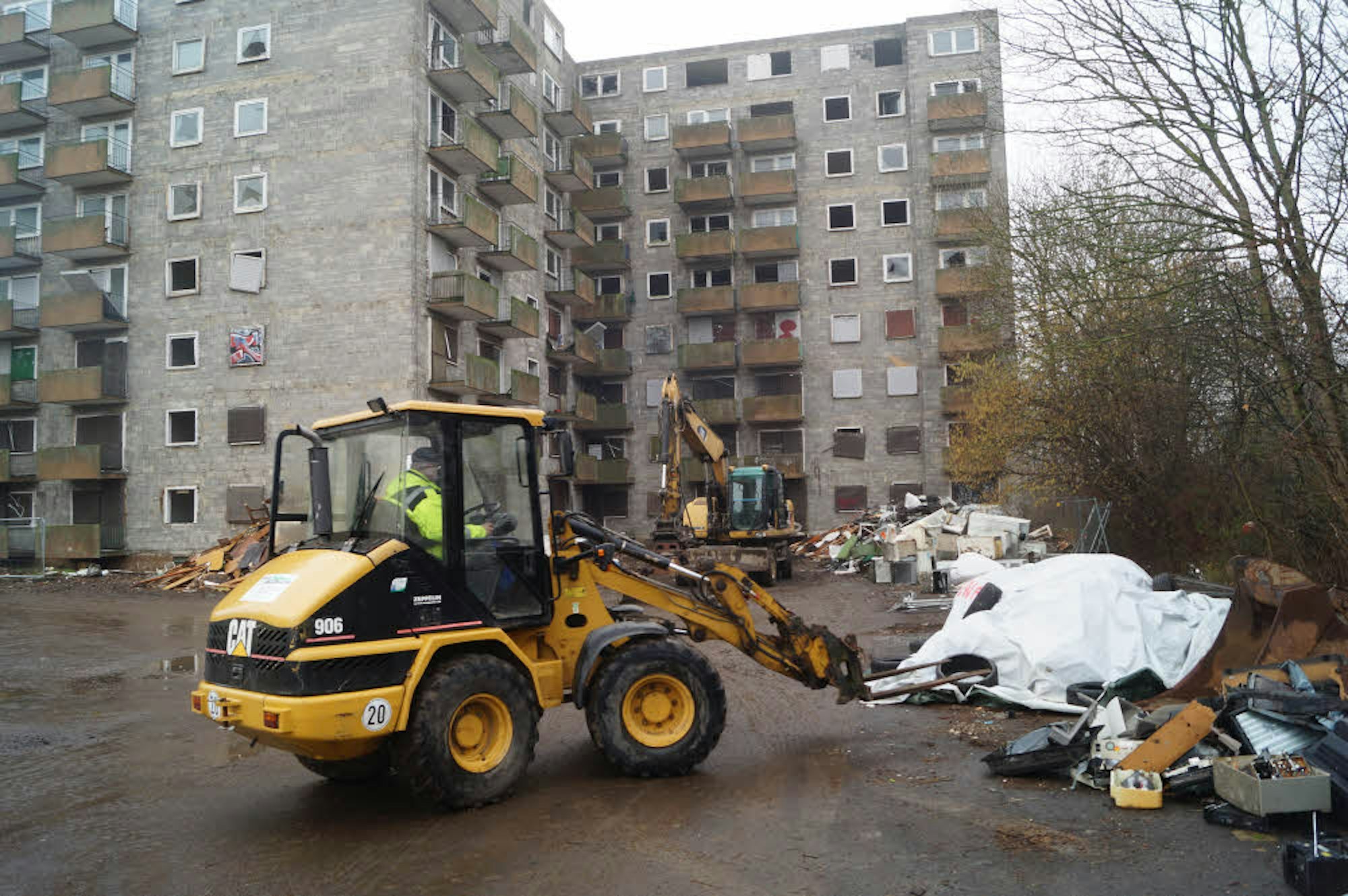 Viel Müll holen die Arbeiter eines Abbruchunternehmens aus dem leergeräumten Hochhaus an der Maastrichter Straße.