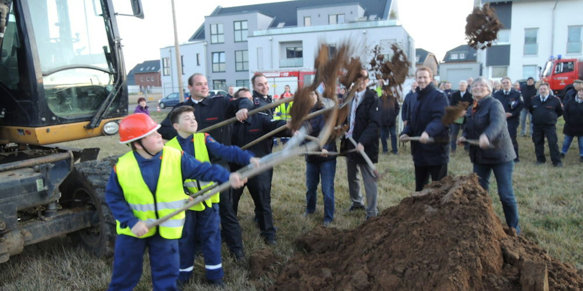 Beim ersten Spatenstich für das neue Multiple Feuerwehrgerätehaus machten Vertreter der Stadt und der Feuerwehr mit.