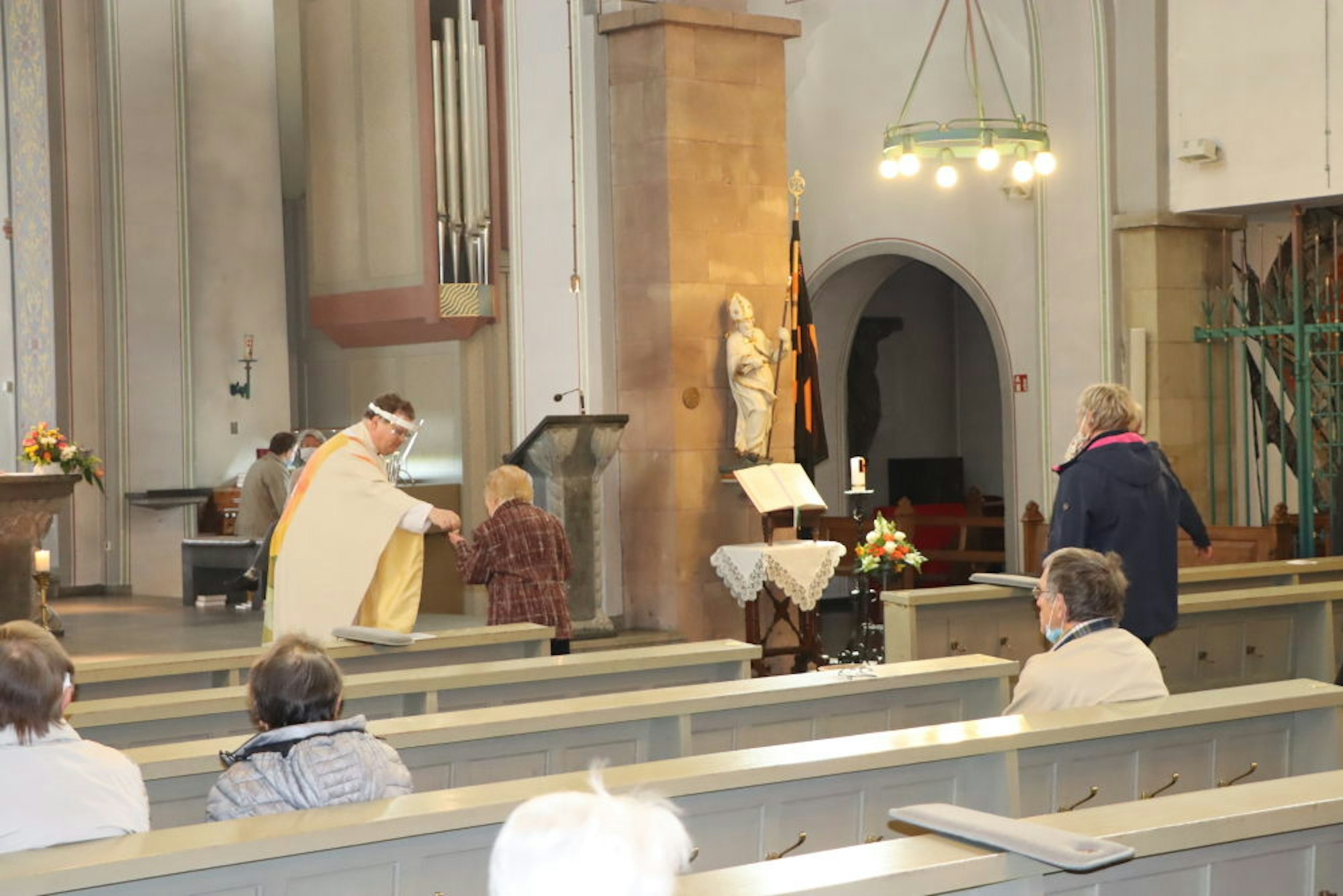 Pfarrer Ludger Möers trug ein Schutzvisier. Die Gläubigen hielten auch beim Gang zur Kommunion den gebotenen Abstand.