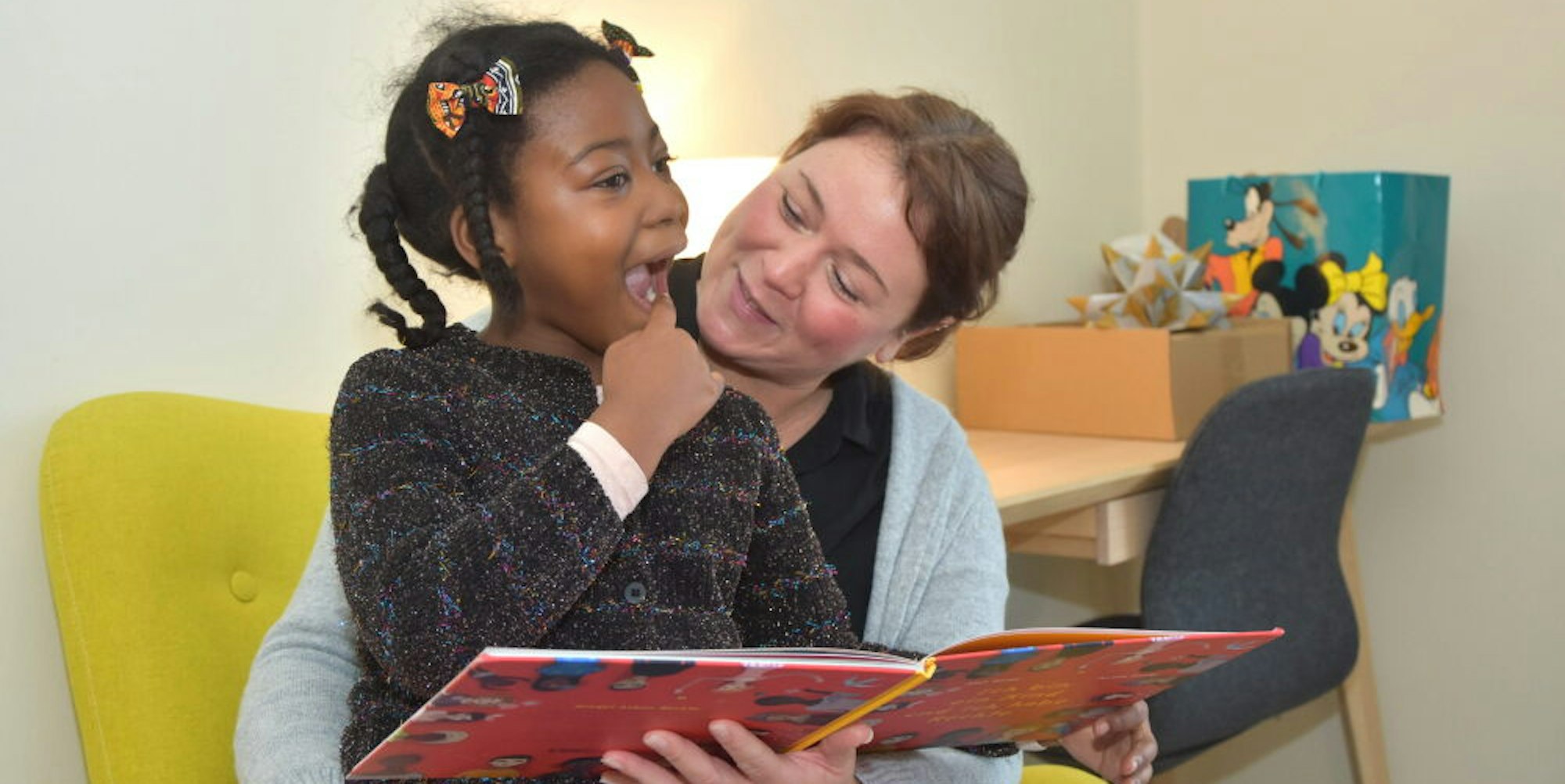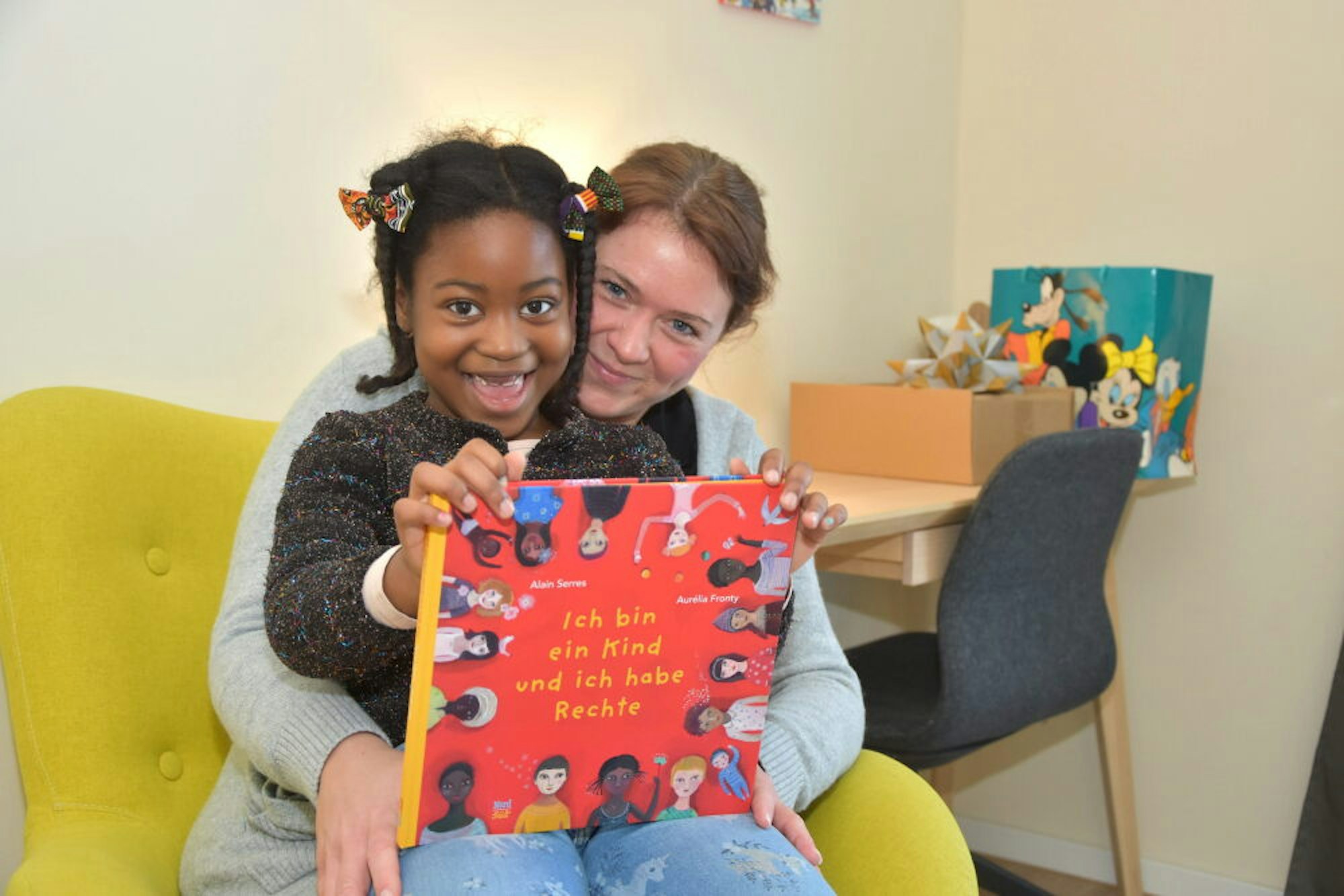 Gabby liest mit Kita-Leiterin Sabrina Gemeinder ein Bilderbuch über Kinderrechte.
