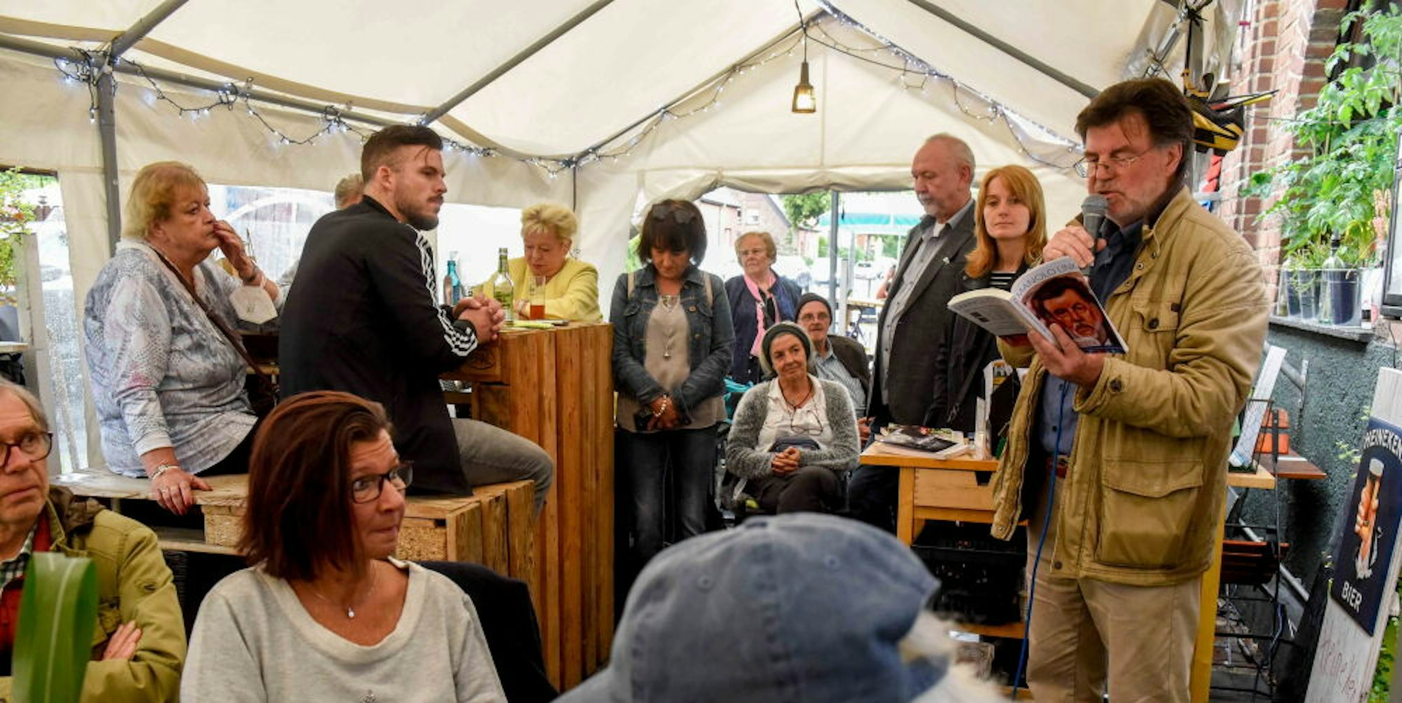 Viele Zuhörerinnen und Zuhörer waren an diesem Dienstagabend ins überdachte Vorzelt an der Kneipe gekommen. Während Manolo Link sich noch in der Kneipe im Gespräch befand, tiefen sie nach ihm wie nach einem Popstar, der sich in der Garderobe vorbereitet: „Ma-no-lo, Ma-no-lo“. Eddy Wildenburg, bekannt als Balkhausener Urgestein und Präsident der KG Rut-Wies Balkhausen-Türnich, moderierte die Buchvorstellung an.