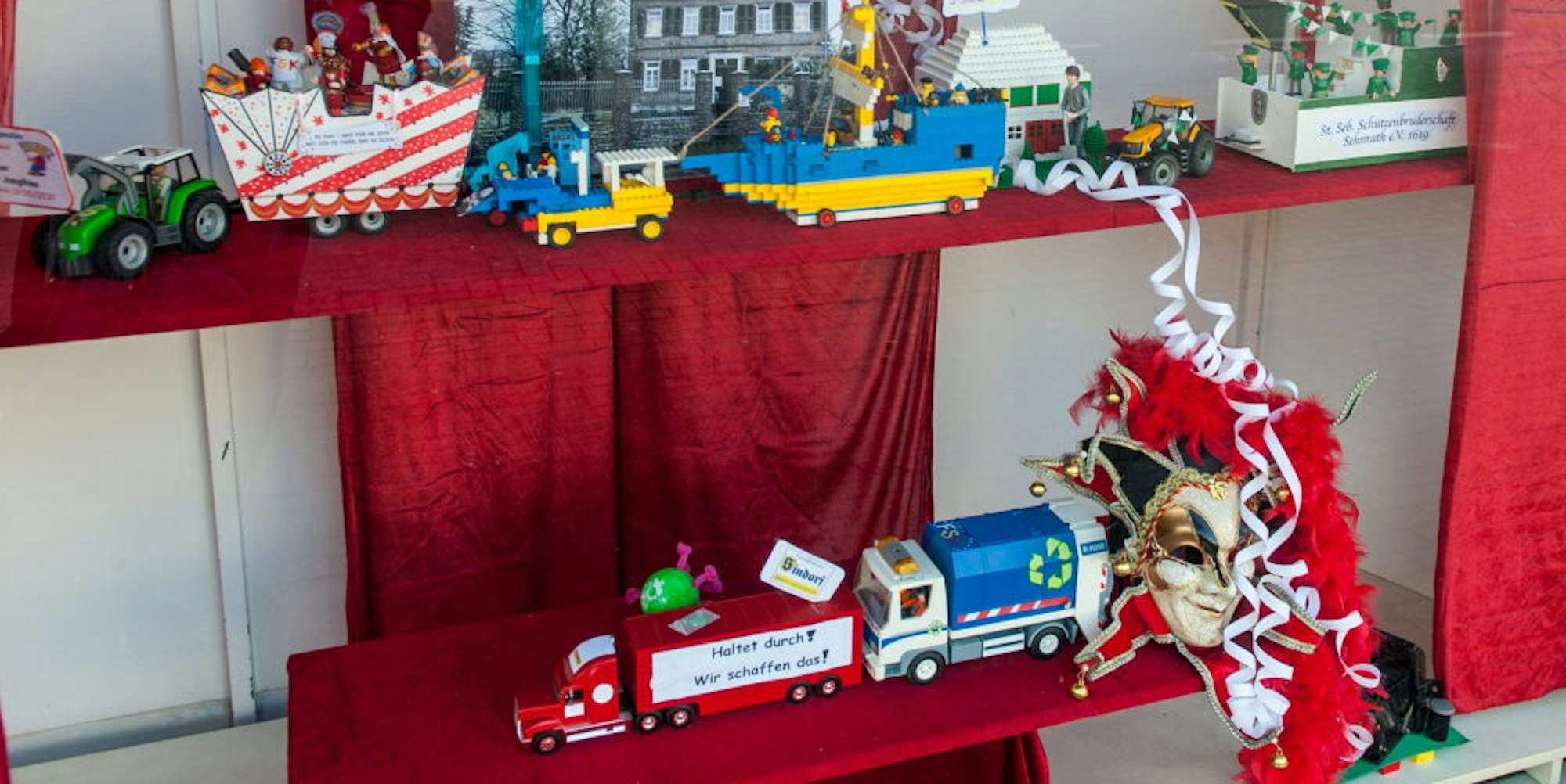 Auf drei Schaufenster der Erftland-Apotheke verteilt ist der Mini-Karnevalszug.