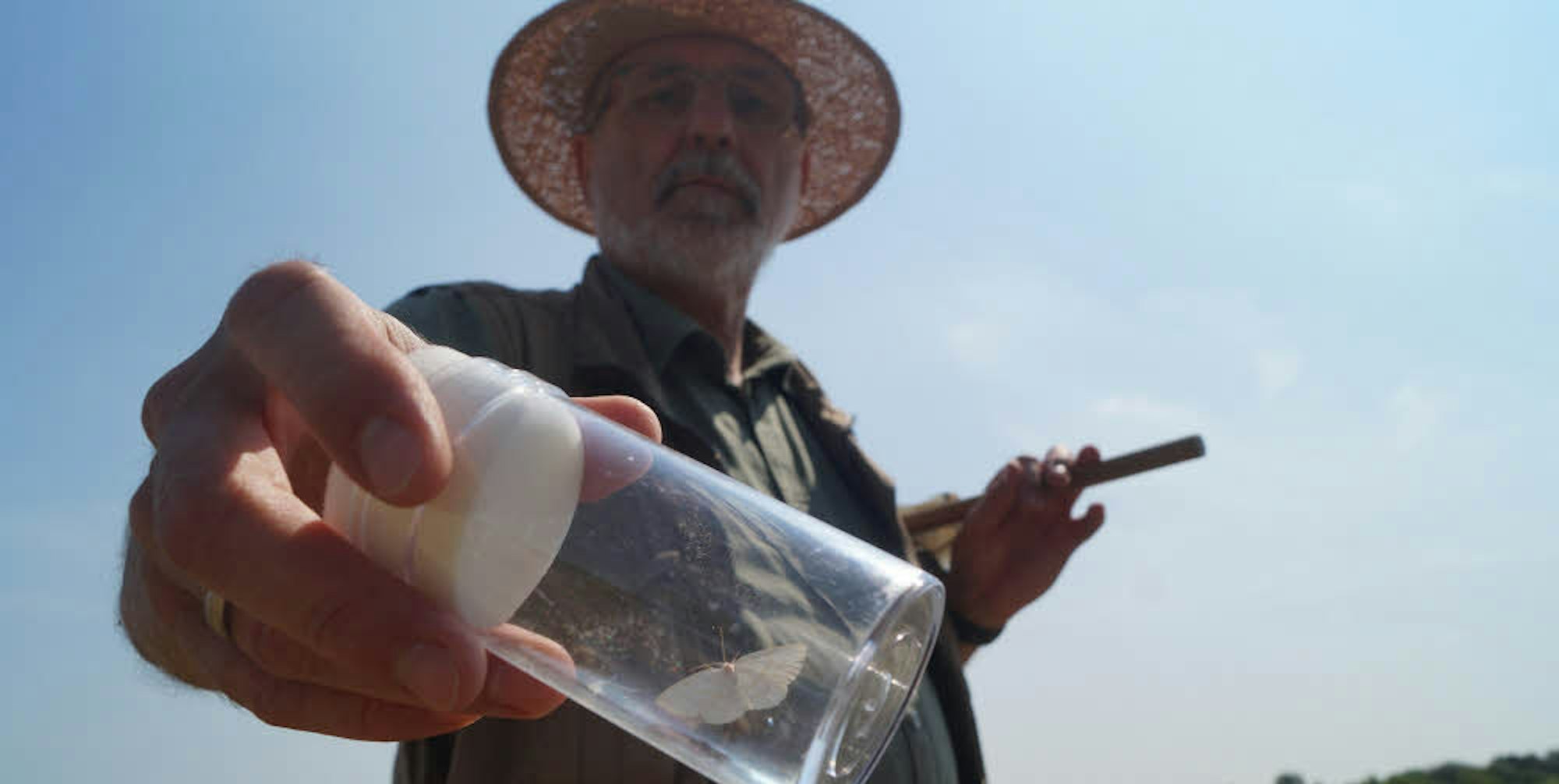Der Braunstirn-Weißspanner, den Insektenexperte Jelinek am Feldrand gefangen hat, ist eigentlich ein Nachtfalter.