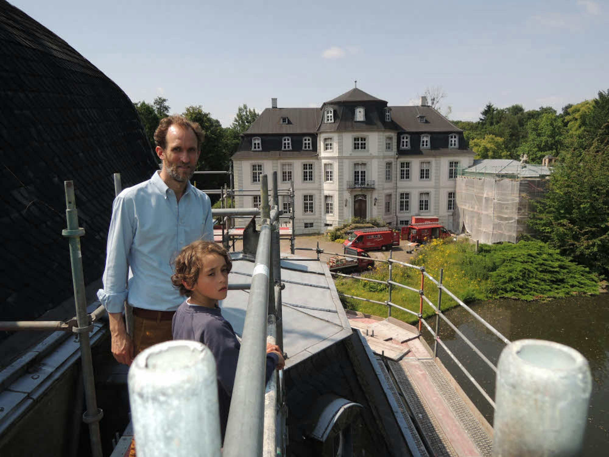 Severin Graf Hoensbroech mit Sohn Nepomuk blicken von einem Gerüst in den Park von Schloss Türnich. Am Dach der Kapelle neben dem Herrenhaus wird bereits gearbeitet.