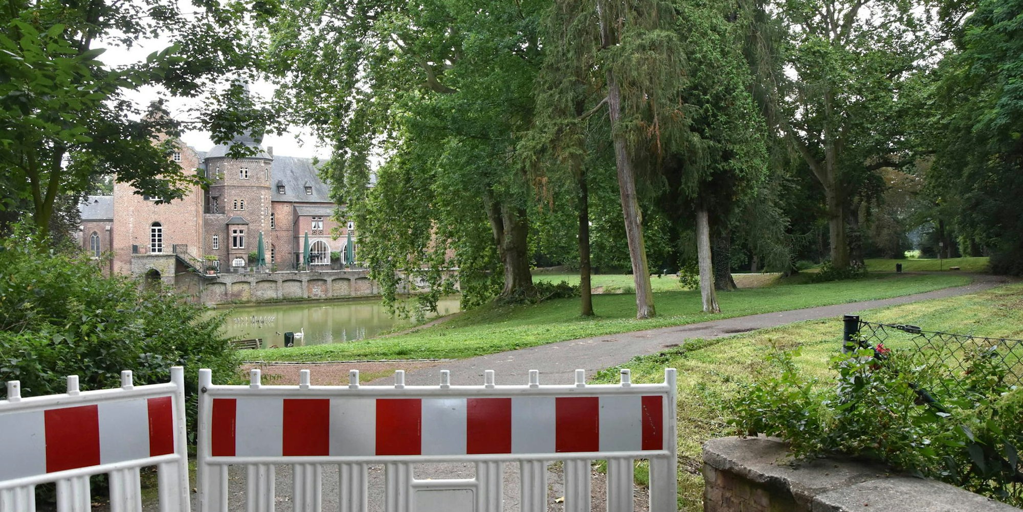 Der nahe der Dürener Straße gelegene Zugang zum weitläufigen Burgpark ist zurzeit gesperrt. Grund ist jedoch nicht drohender Astbruch, sondern der Schwan, der gelegentlich durch dieses Schlupfloch den Park verlässt. Der Zugang neben dem Batterieturm ist geöffnet, und Spaziergänger können das prächtige Ambiente von Schloss und Park genießen.