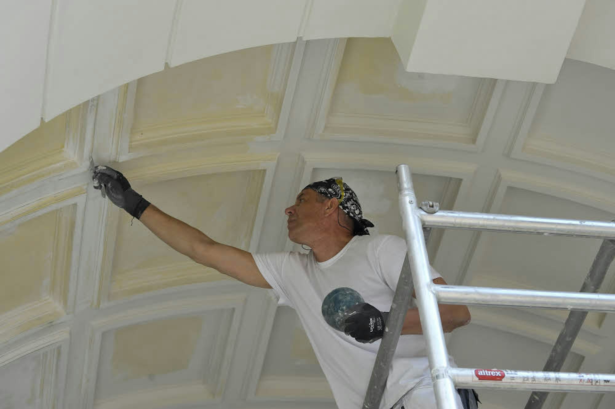 Stuckateur Slawomir Lewandowski bessert hier die Kassetten der gewölbten Decke der Toreinfahrt aus.
