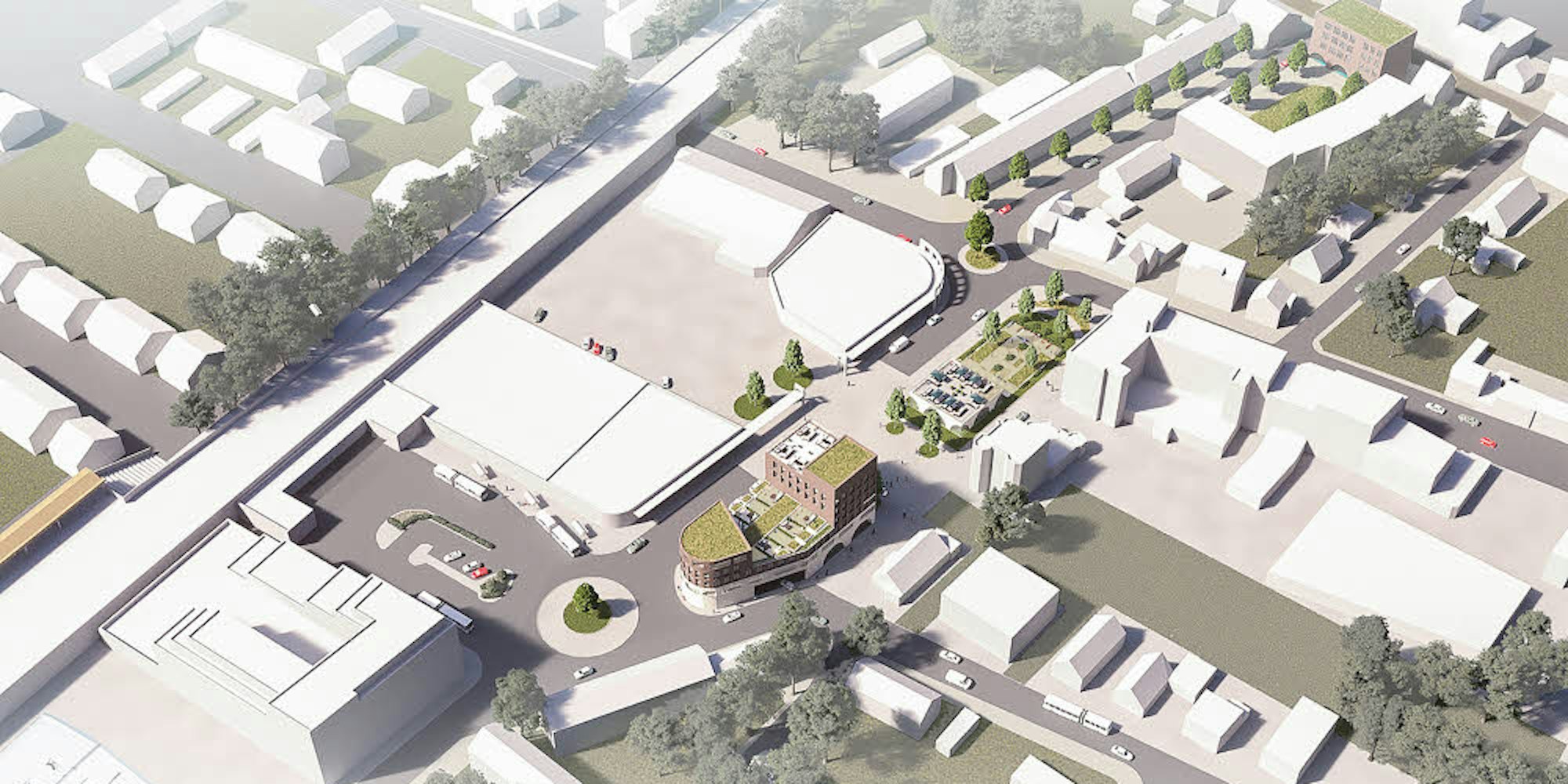 Neben dem Sindorfer Busbahnhof und dem Bahnhaltepunkt (l.) sollen zwei moderne Gebäude entstehen.